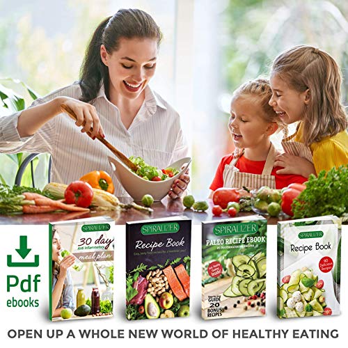 • Best Rated, Latest Design With Unmatched Value: Don't waste your hard earned money on other old & weak 5-blade designs. Our All New Improved 10-blade is GUARANTEED to be markedly stronger than any of the others on the market. You get a complete spiralizing bundle with 10 interchangeable blades, extra blade caddy for safe blade storage, printed color user manual, easy online quick-start guide with our demo videos, and 4 exclusive Spiralizer Ebooks with recipes you can make for the whole family!