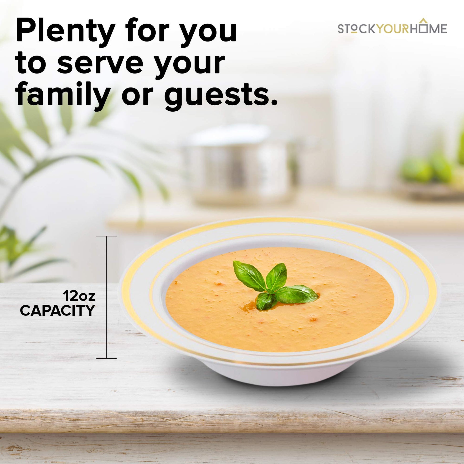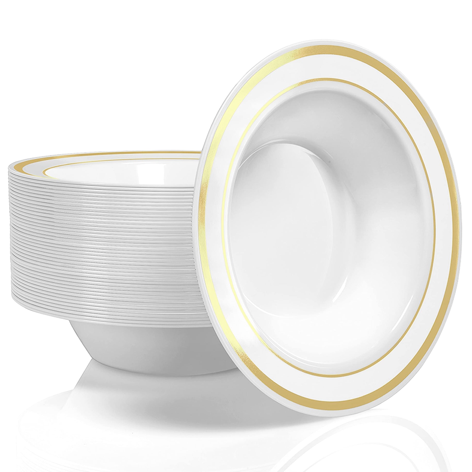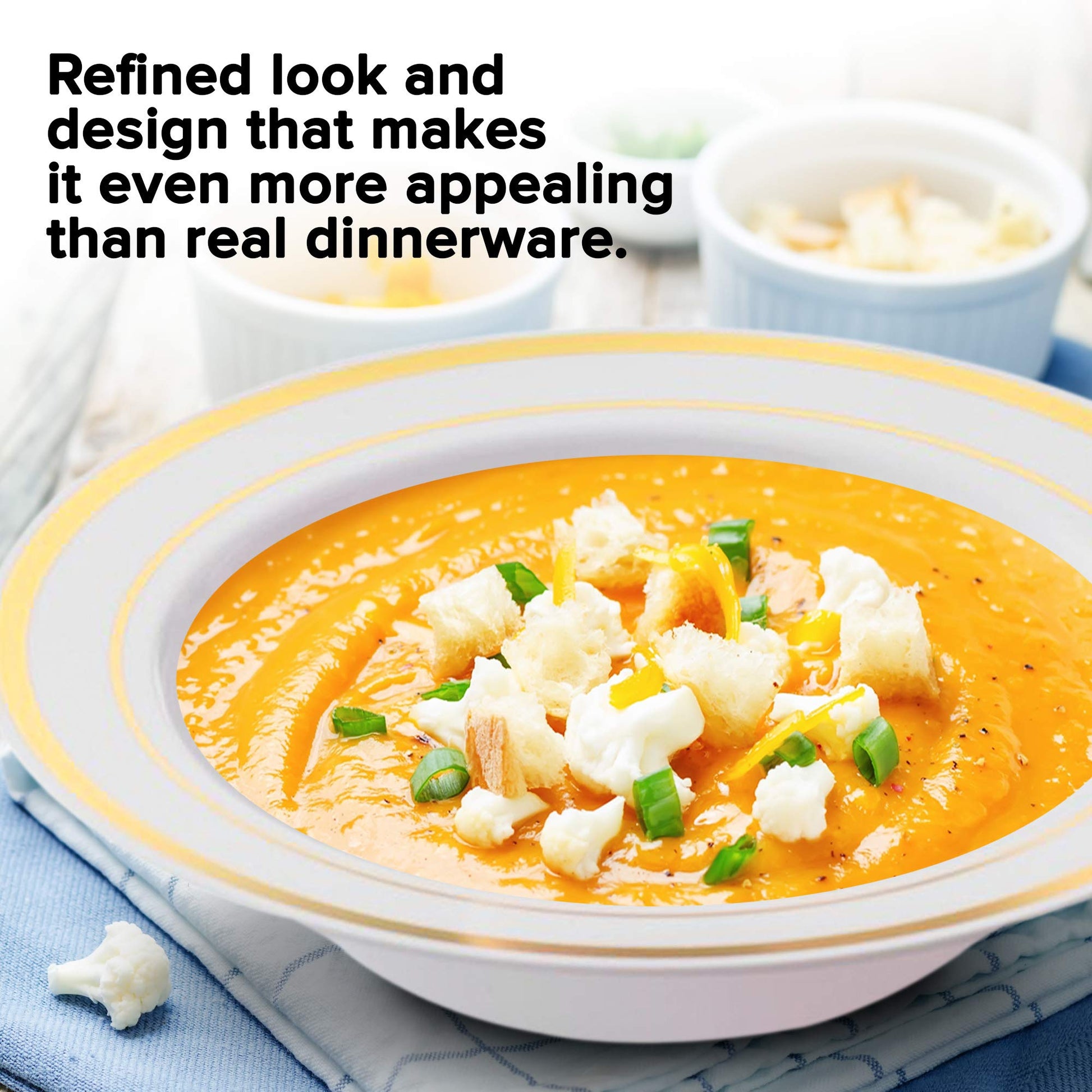 - Great Value Pack: This 50-piece set of 12-ounce white gold-rim soup bowls are plenty for you to serve your family or guests multiple courses.