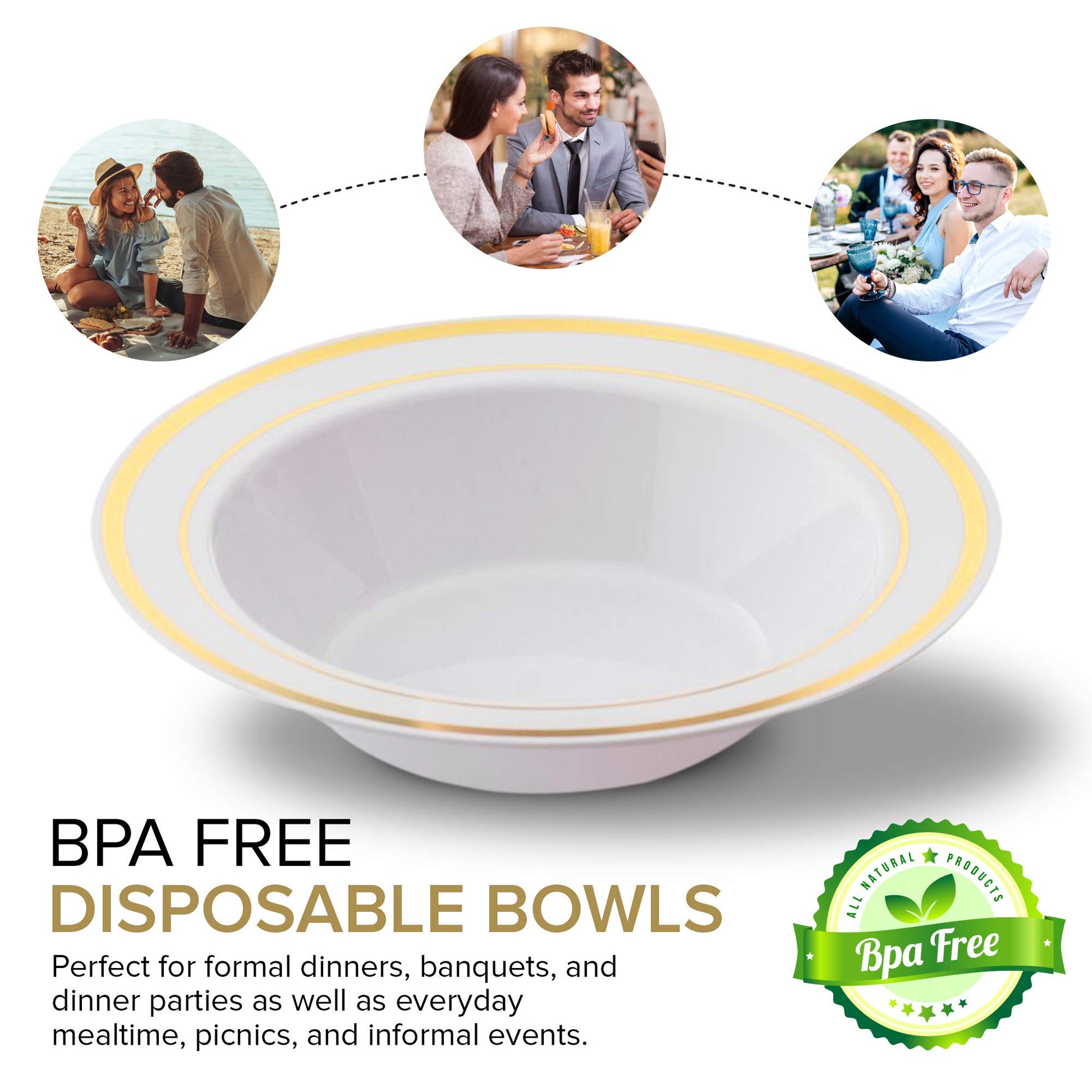 - Reusable & Durable: Made of recyclable and reusable plastic that is sturdy and durable, with a real dinnerware look. These bowls are not microwaveable due to the foil-coated rim.