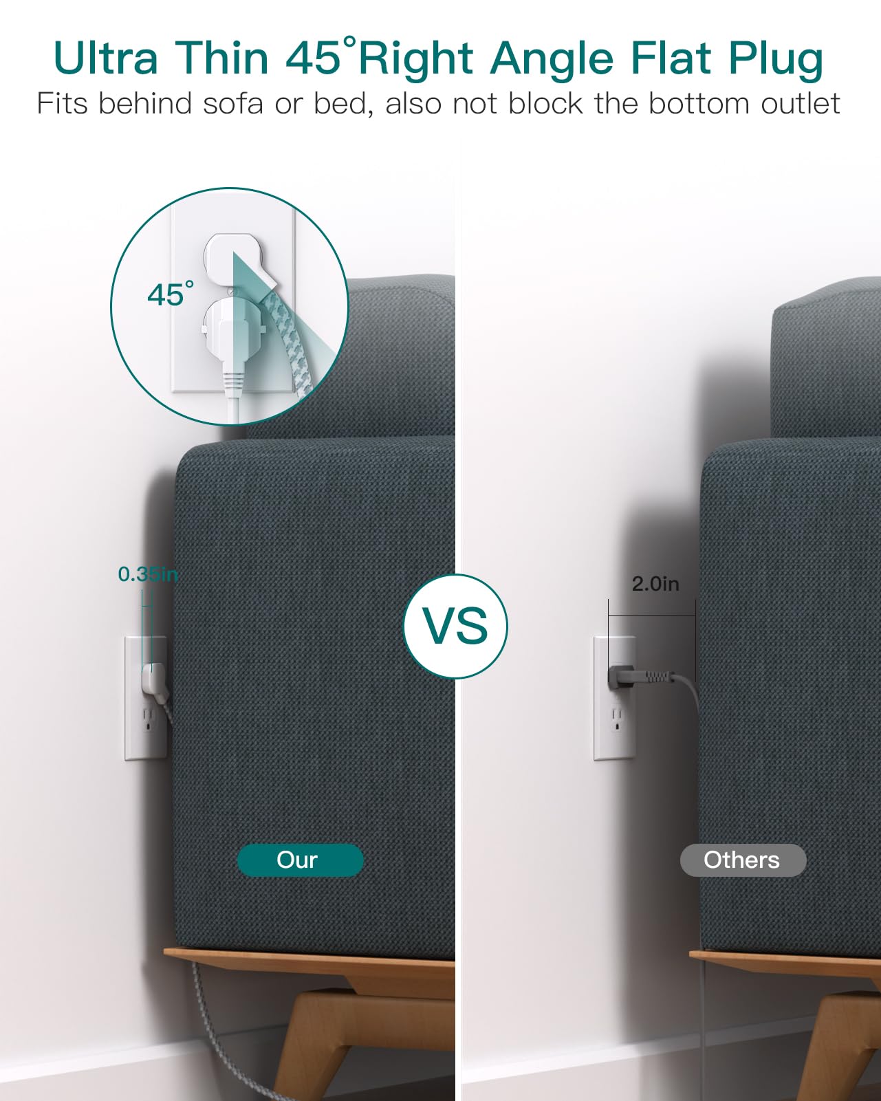 - 【15 Ft Flat Pulg Extension Cord】- Upgraded braided extension cord 15ft is made of 100% copper wire, and the power cord is long enough to reach the corner. With only 0.35 inch ultra thin plug and 45-degree right angle design, which is much slimmer than traditional plugs, which can close to the wall easily, and hide in the back of furniture, bed or refrigerator