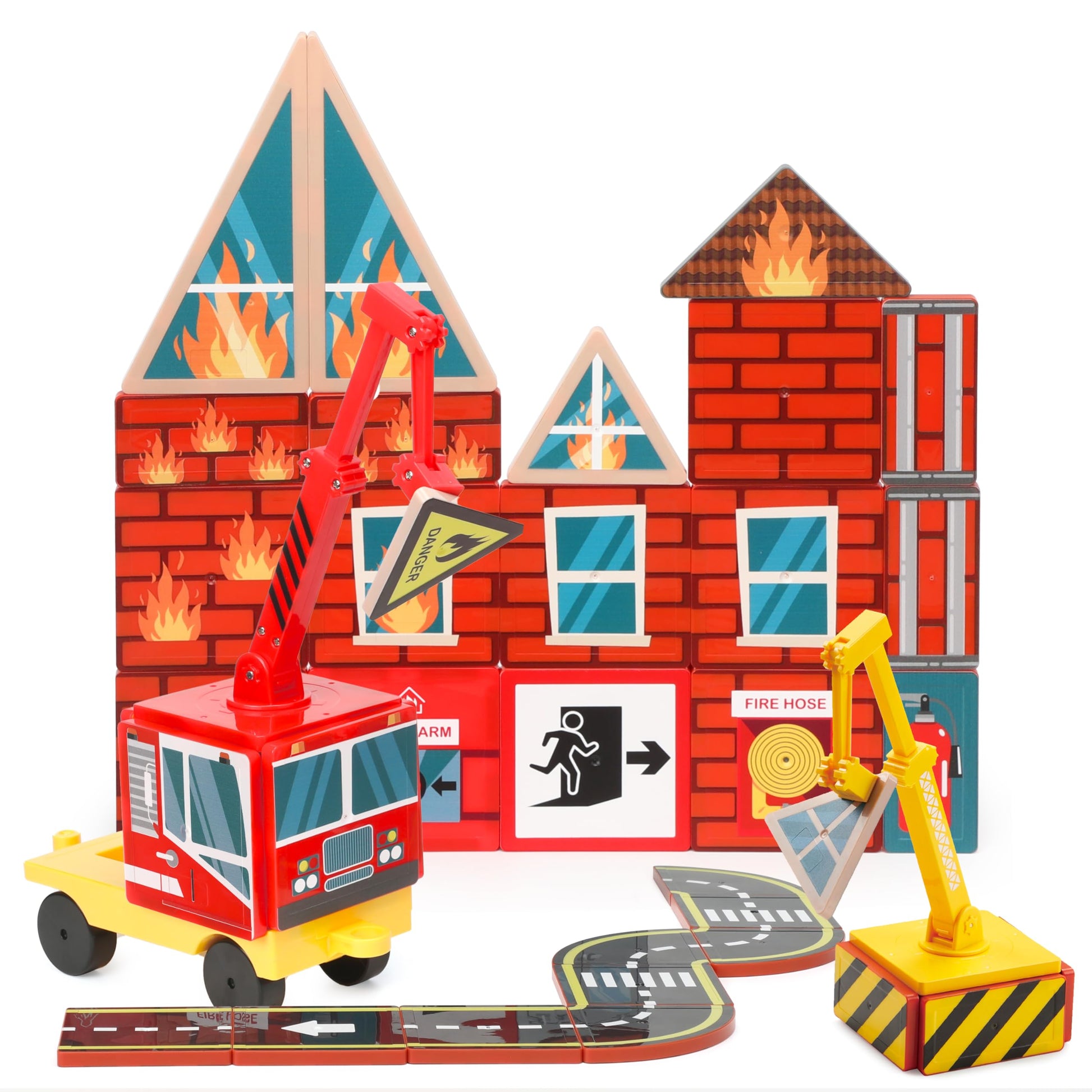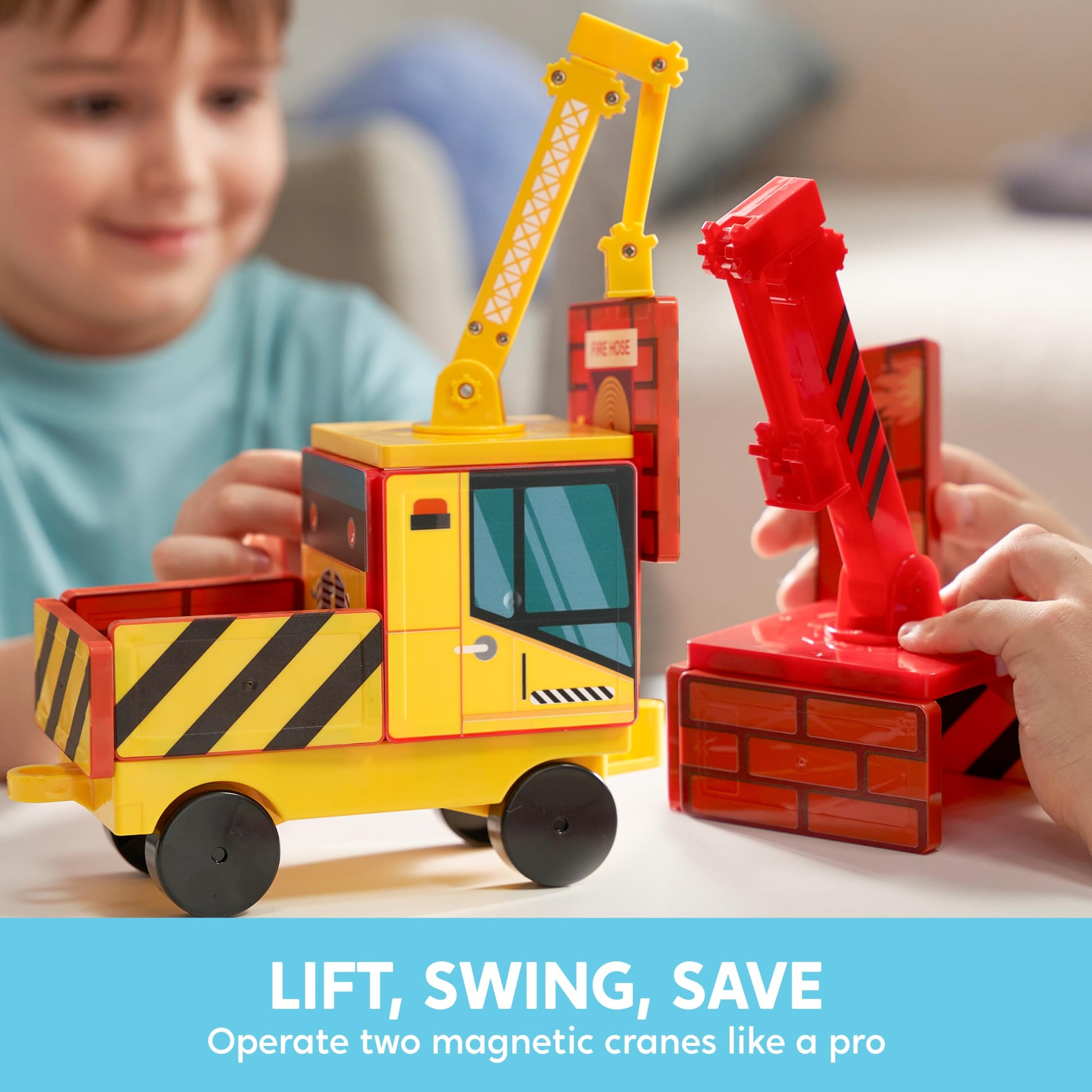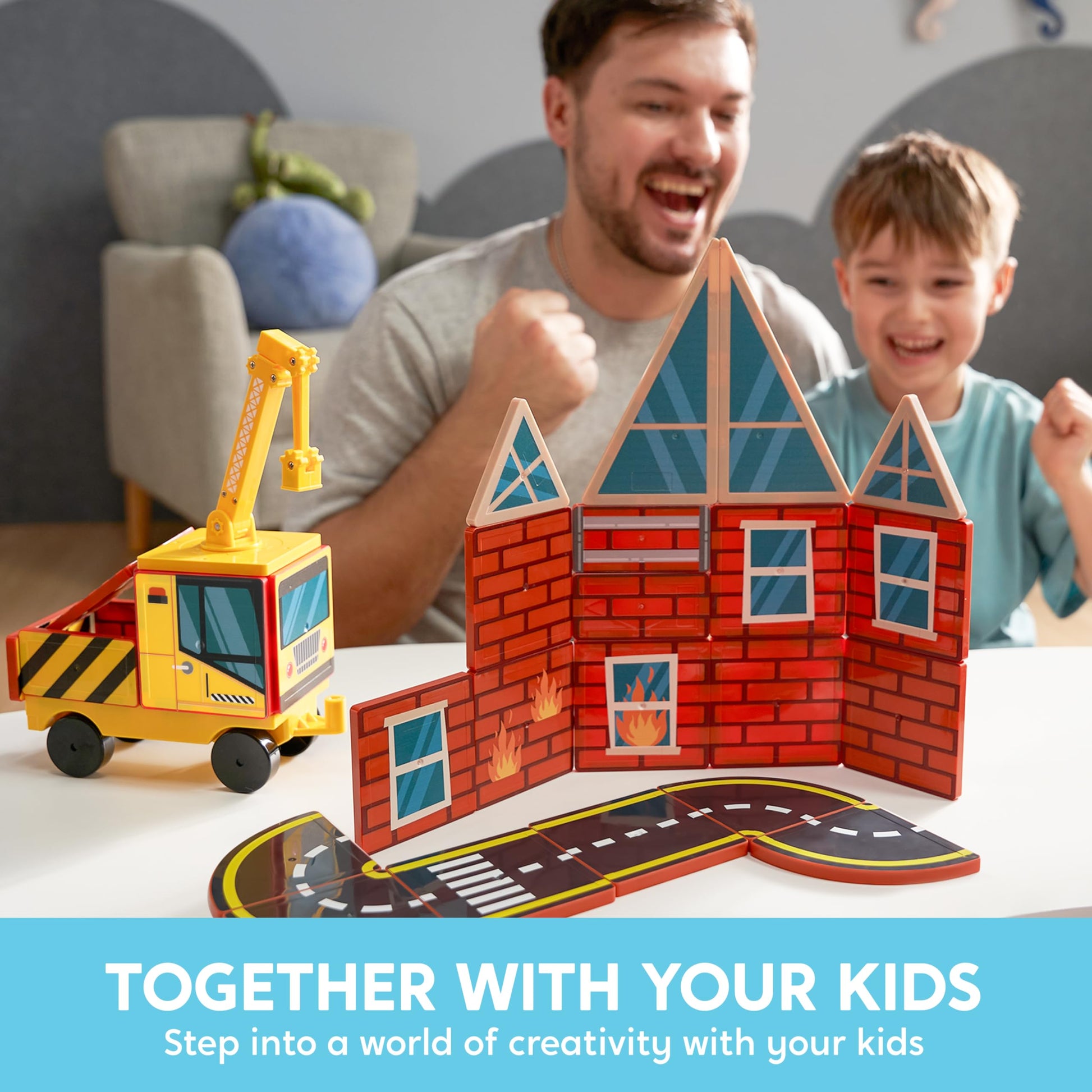 - Trusted Quality: Made from ABS material with stronger magnets. The set includes cranes, construction vehicles, fire trucks, roads, fire and traffic signs, fences, and more. The crane magnetic building tiles can rotate and extend, providing highly interactive play.