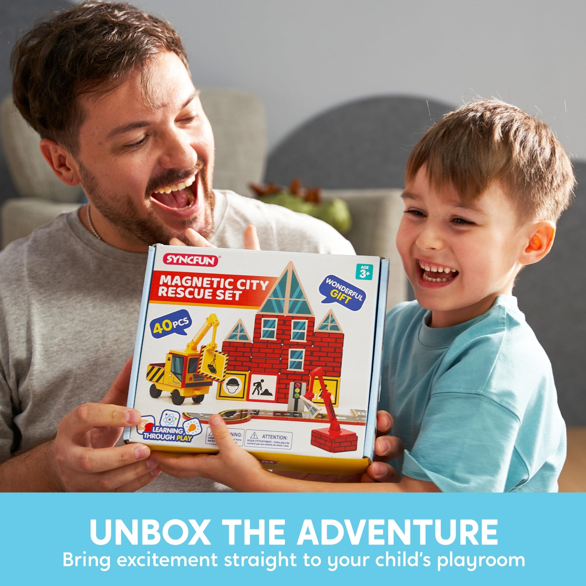 - Rich Accessories: Includes 40 pieces, such as a vehicle, two extendable magnetic cranes with different themes, and popular road parts. Kids can transform ordinary magnetic blocks into special scenes like construction sites, fire emergencies, and road rescues, exploring their imagination to create exciting tasks!