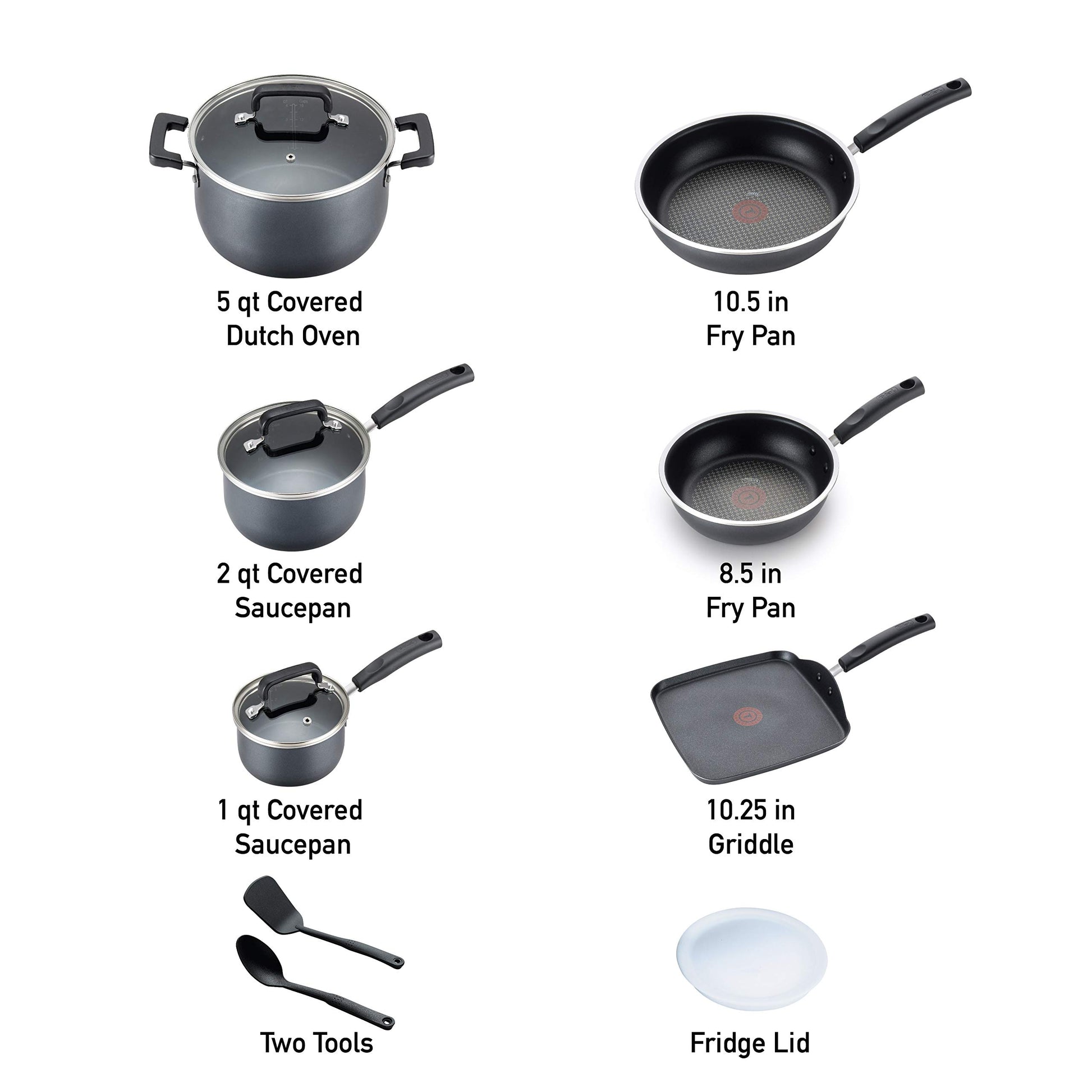 - Included components: 8”/10.5" Fry pans w/ pour edge, 10.25" Square Griddle, 1qt /2qt Saucepan w/ measuring marks, 5.5qt Dutch Oven with Lid & measuring marks, fridge lid (for a 2 qt saucepan), spoon, spatula