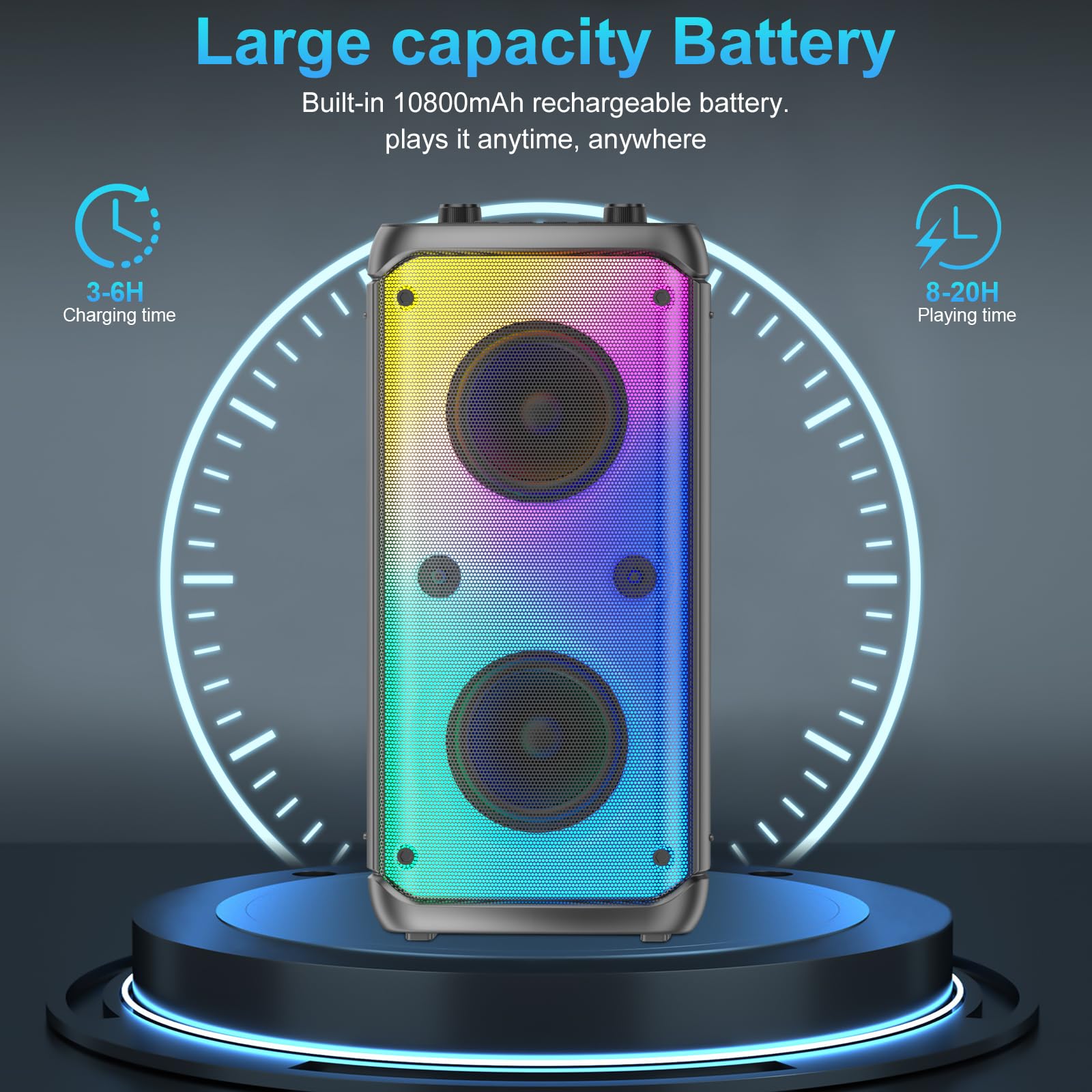 - ♫ Color Disco Lights: The Q55 PA bluetooth speaker is designed with multiple dynamic light modes to light up every corner of the party space, and Colorful Disco LED lights can change the lighting effect according to the rhythm of music, which colourful and vibrant can give your home party, beach, camping or outdoor travel an exciting atmospher. You can enjoy the light show while listening to your favorite music, giving you an unforgettable karaoke experience.