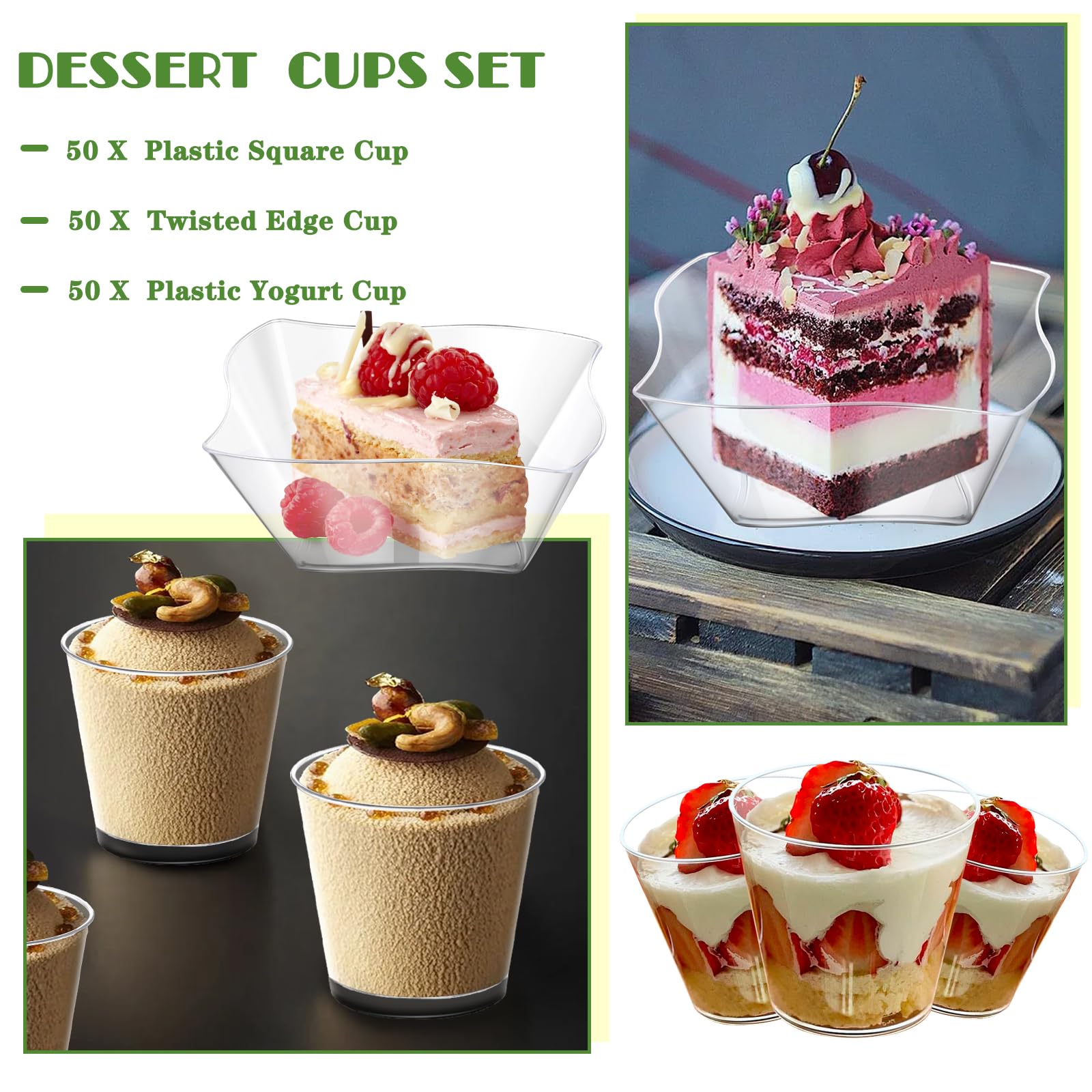 - 【Package Includes】: This dessert cup package includes 50 5oz Square plastic dessert cups, 50 twisted Edge dessert cups, 50 plastic yogurt cup and 150 spoons. Suitable for group gatherings and enjoying happy times at the same time