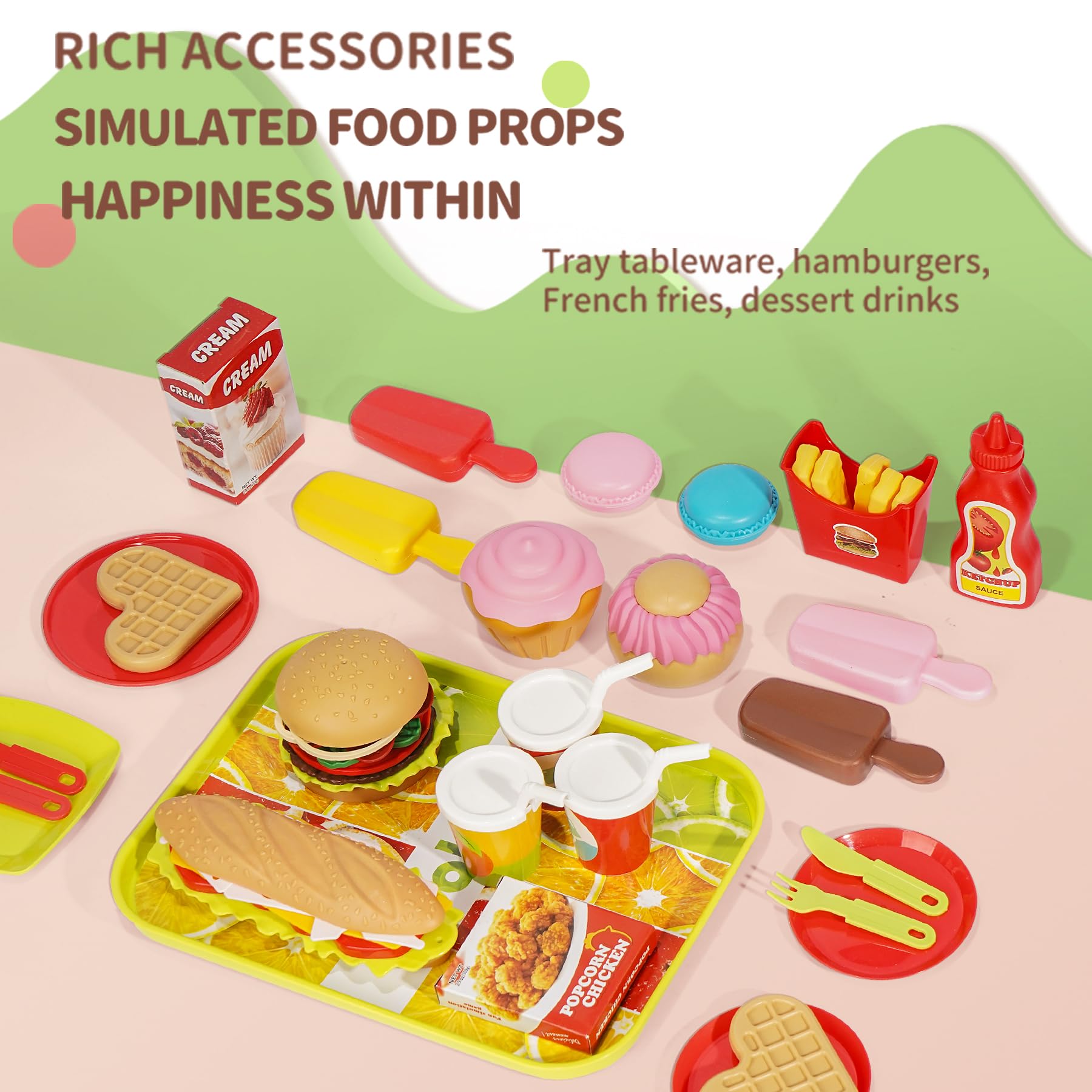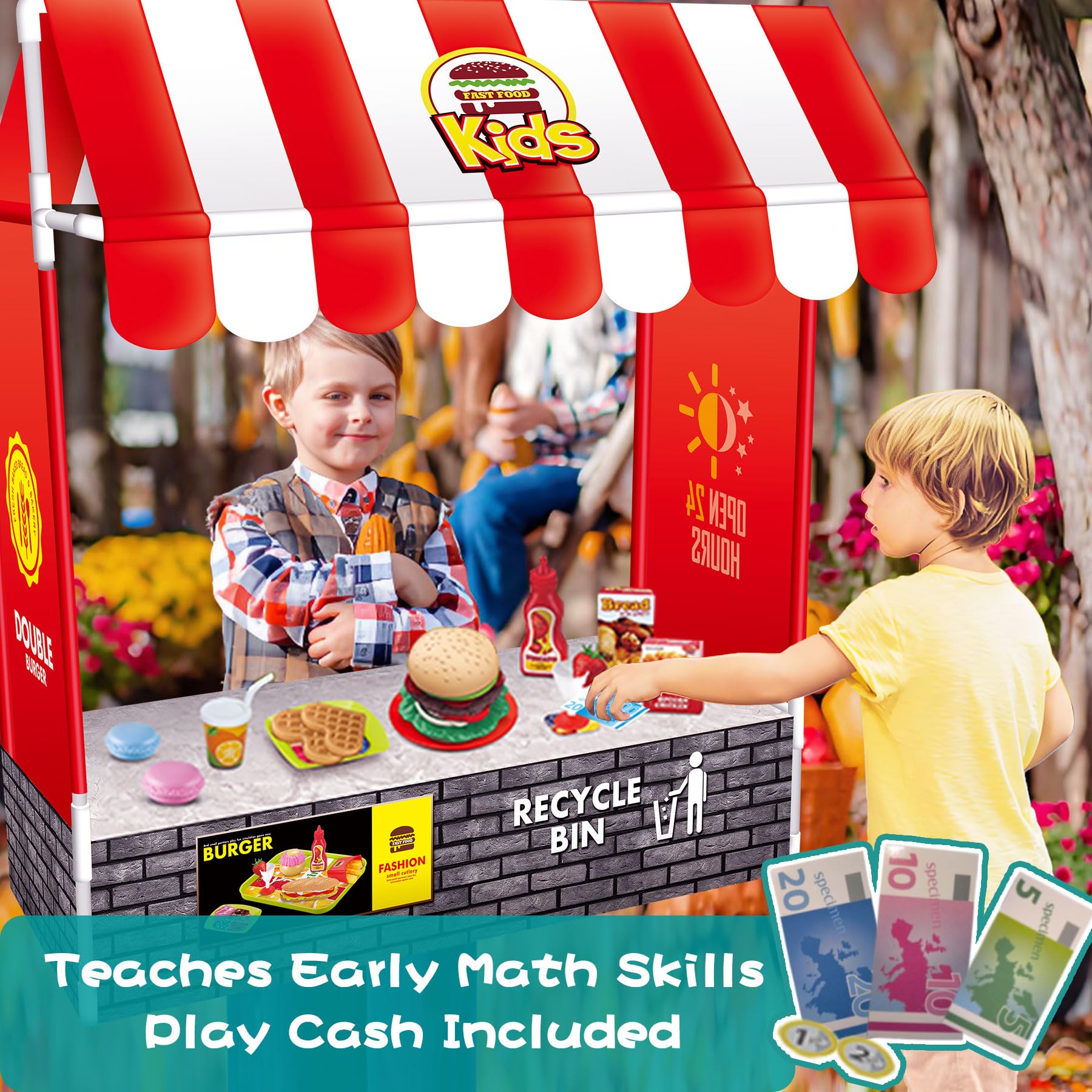 - COMPLETE PRETEND PLAY SET: Our Play Tent for Kids includes plenty of dessert accessories (e.g. ice cream, macaroons, cakes, waffles, etc.), fast food toys (e.g. chips, hamburgers, sandwiches, etc.), a menu and plenty of play money. The ample storage space for other kitchen utensils that will fully satisfy children's demand for cash play toys and provide endless satisfaction and enjoyment