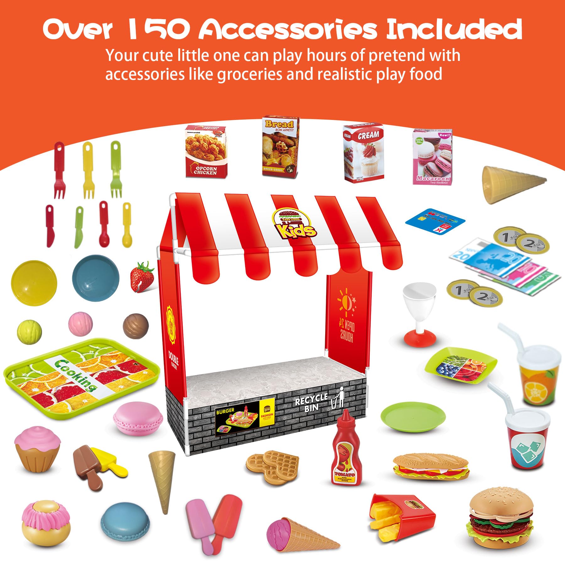 - ENDLESS IMAGINATIVE PLAY: Our Kids Kitchen Playhouse toy with over 150 pieces of play food toys, kids play tent and a menu card and play money, they can cook up a storm, serve hungry customers. Let their imaginations run wild as they create unique dishes and explore the world of culinary adventures. This play store toy is perfect for creative role-playing