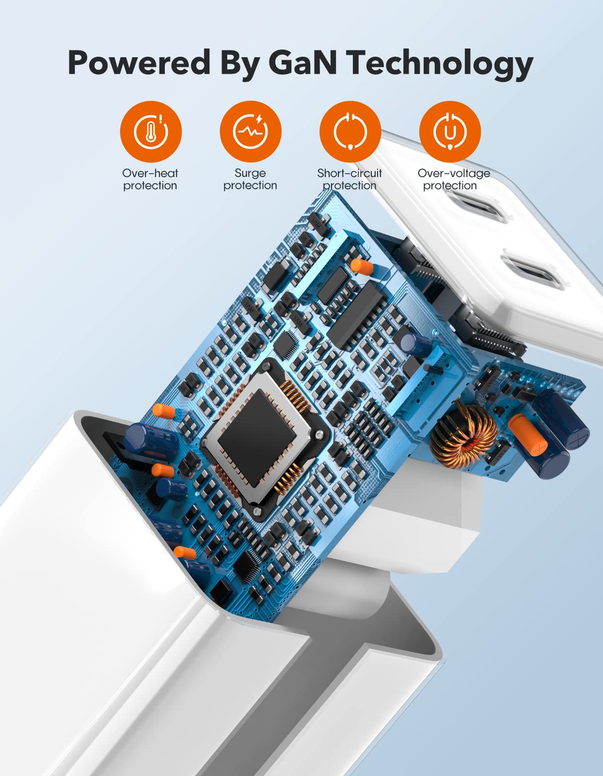 - 【35W Dual USB-C Port Fast Charger Block】: USB-C power adapter with GAN technology,Charge more efficiently,smaller and lighter, provide over-temperature, over-current, and over-voltage protection during charging.