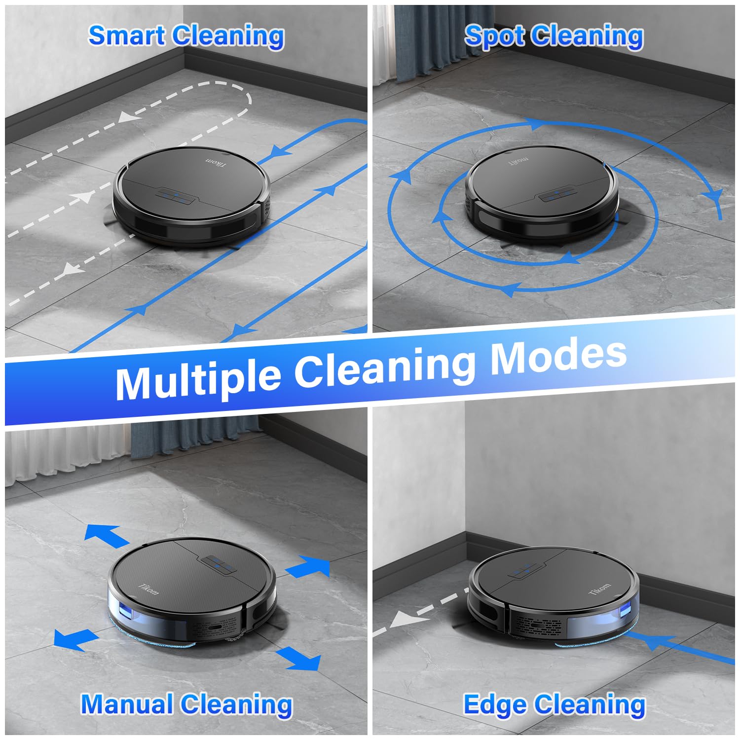 - [6 Cleaning Modes]: Tikom G8000 has 6 cleaning modes: Smart Cleaning, Edge Cleaning, Spot Cleaning, Random Cleaning, Manual Cleaning and Schedule Cleaning. It can meet daily house cleaning