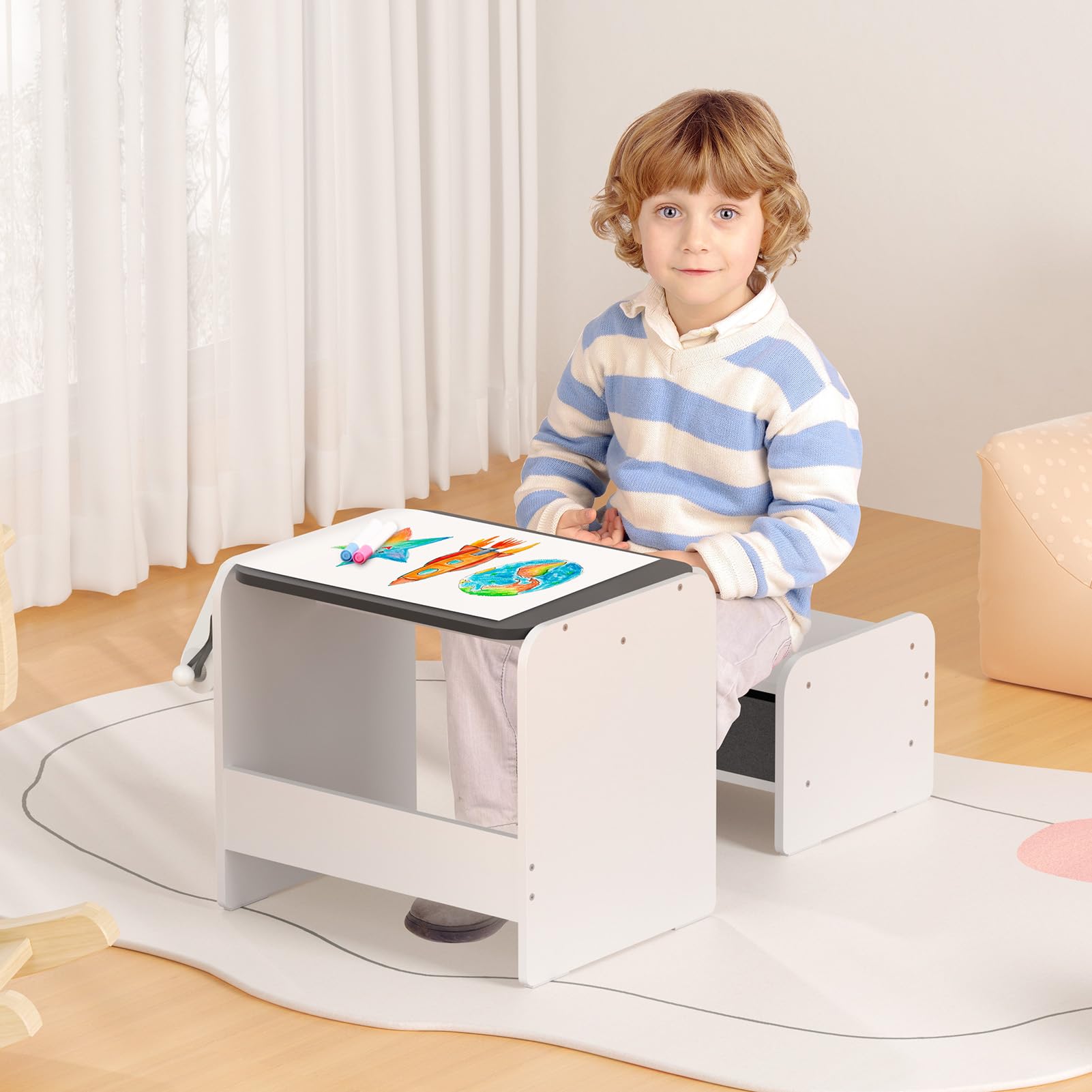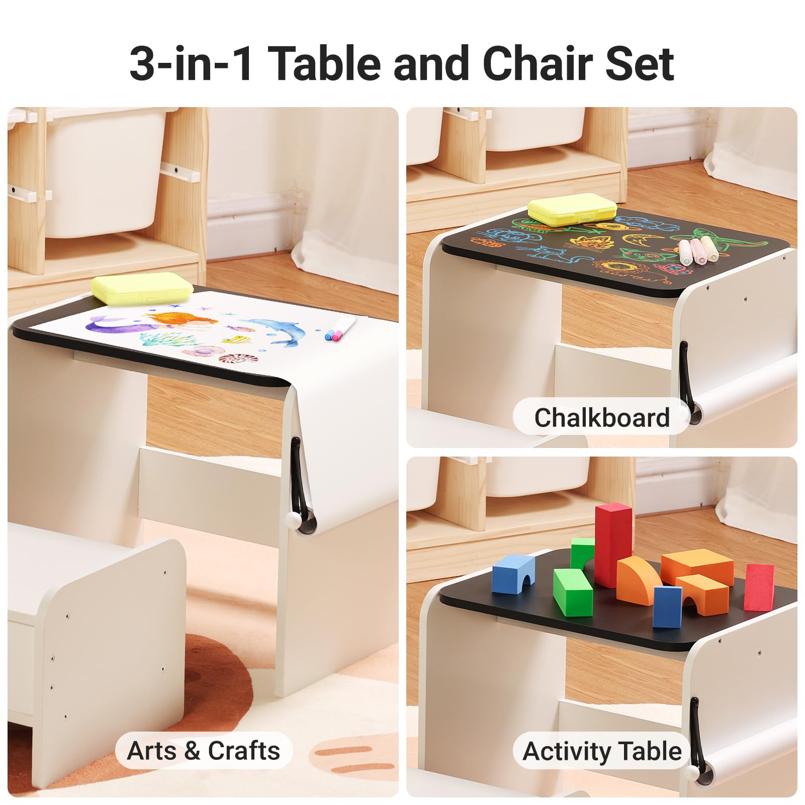 Tilhumt 3-in-1 Drawing Table and Chair Set for Kids Aged 2-5, Toddler Wooden Art Table with Paper Roll Holder & Drawing Accessories, Activity & Craft Table with Storage Drawer, Gift for Kids