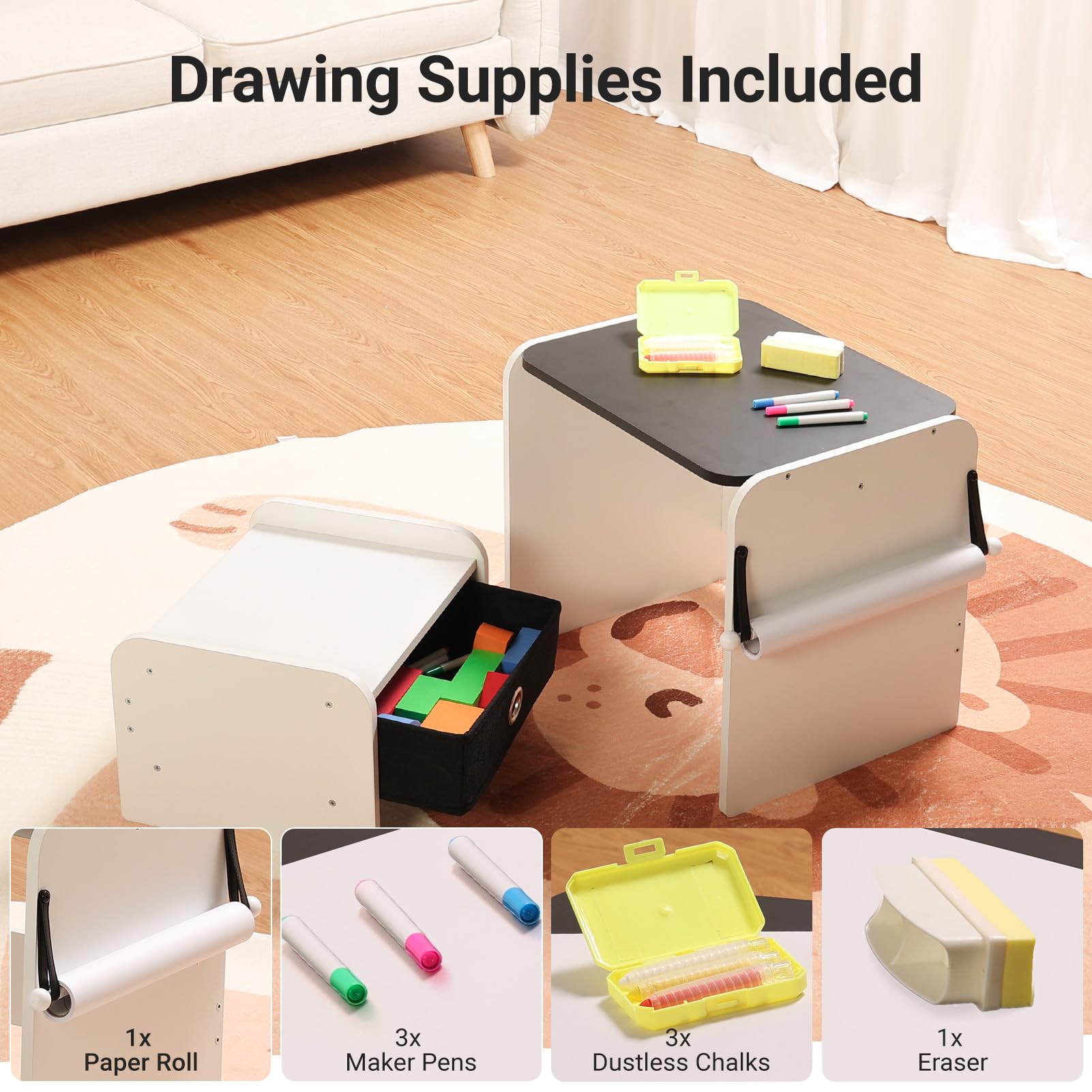 - DRAWING SUPPLIES INCLUDED - The toddler art desk comes with a 5-meters replaceable paper roll, 3 markers, 3 dustless chalks, and 1 eraser. This comprehensive set enables your kids to start their artistic journey immediately after receiving the package, fostering their creativity and imagination