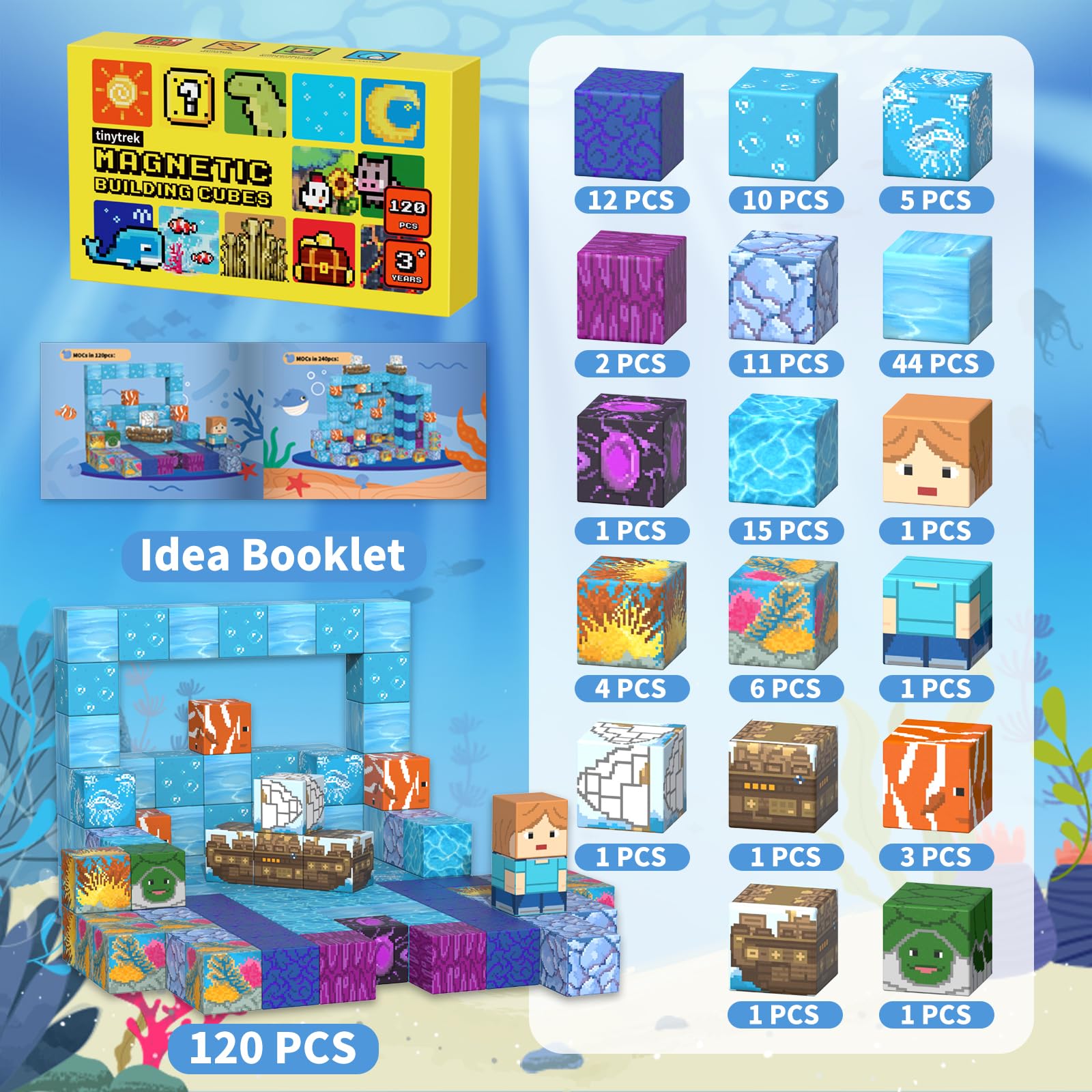- MAGNETIC BLOCKS ADVENTURE: Tinytrek Magnetic Building Blocks has included 120 PCS Ocean Quest, measuring 1'in on every side. This set offers a variety of 17 distinct natural element patterns, including Jellyfish, fish, turtles, coral, sea water, boats and so on. Our magnetic toys opens up a world of imagination and creativity for children as they build and explore their Underwater World adventure.