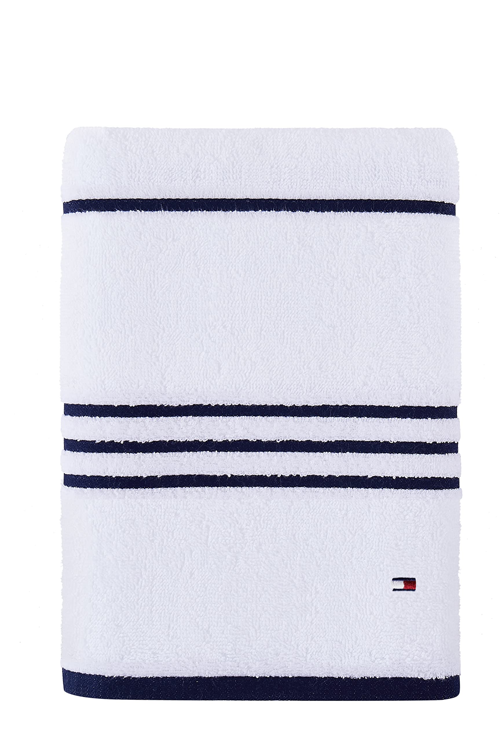 Tommy Hilfiger Modern American Stripe Bath Towel, 30 X 54 Inches, 100% Cotton 574 GSM (White/Peacoat)