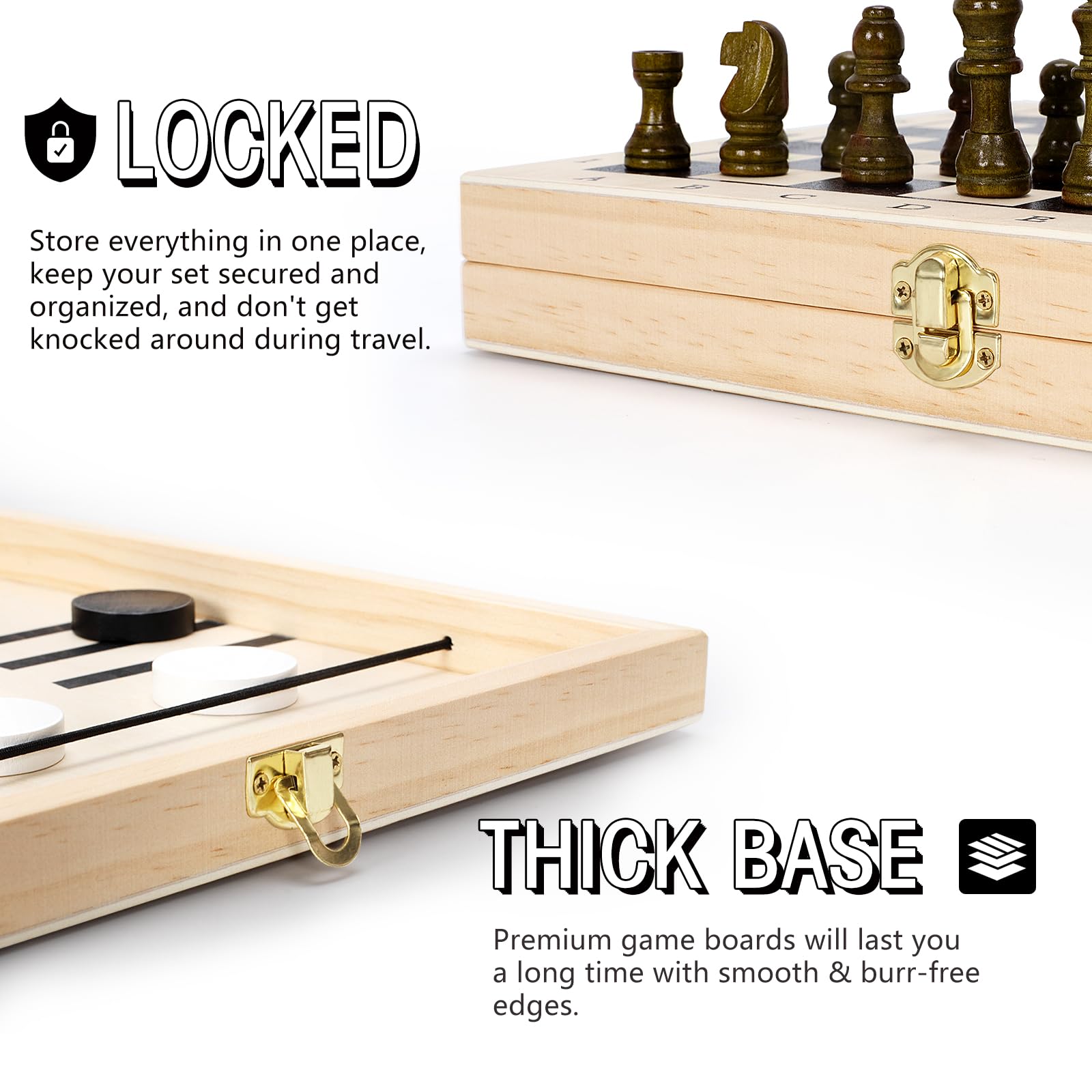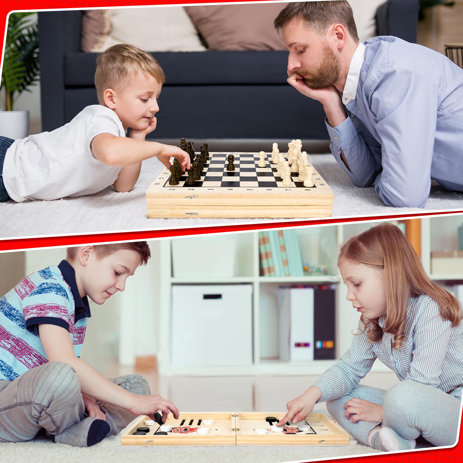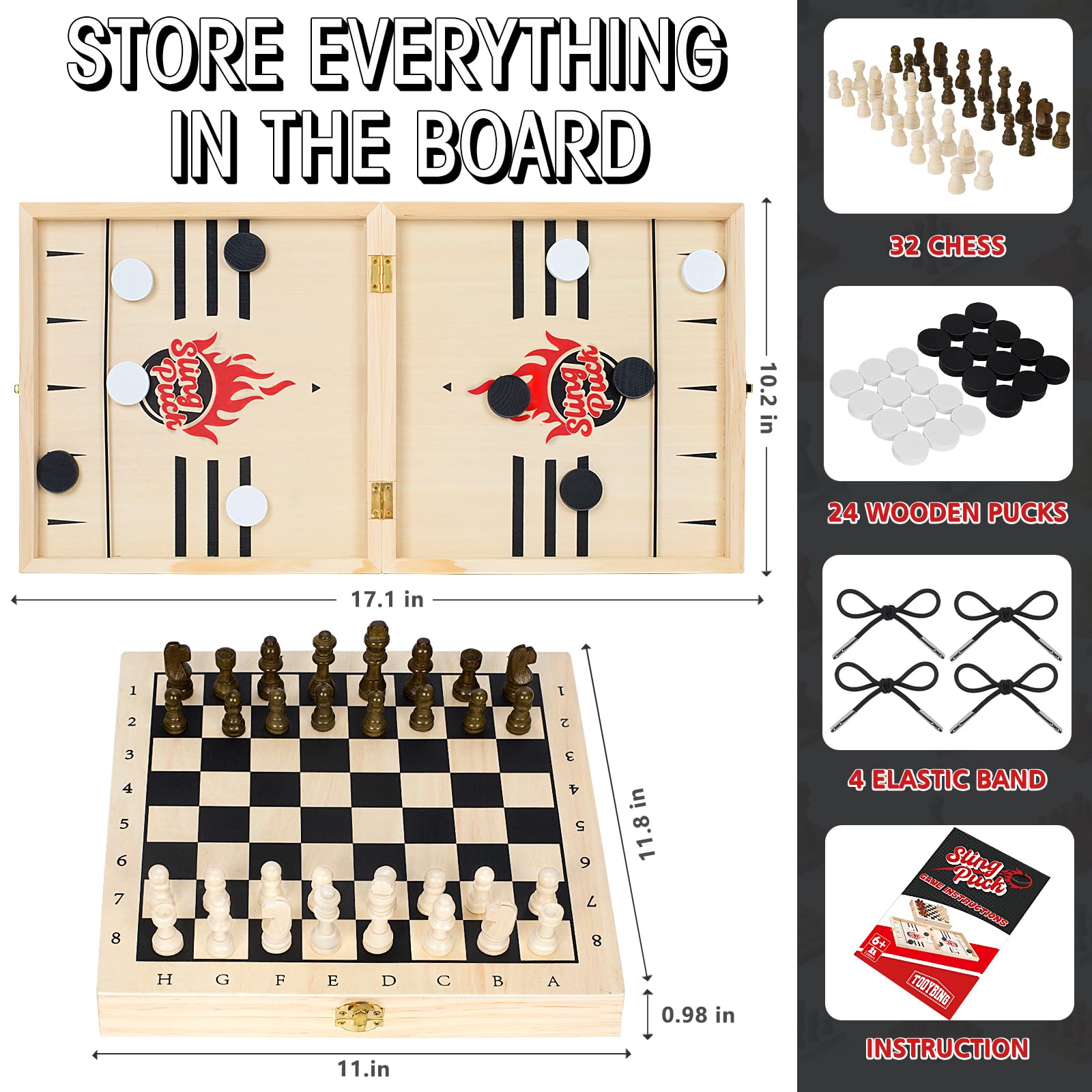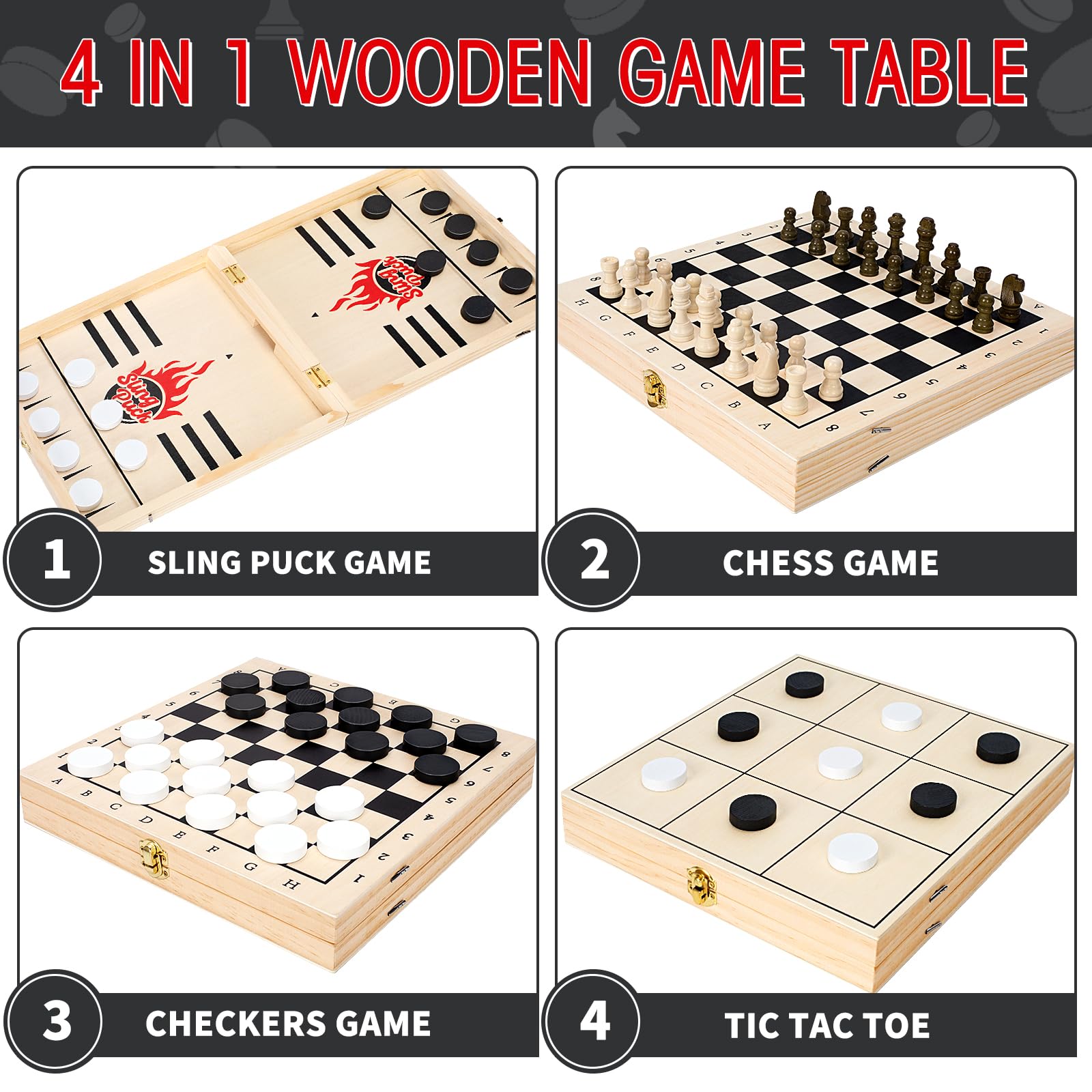 - 4 in 1 Wooden Board Games: The set includes a board, 24 pucks, 32 chess pieces, 4 black elastics, an instruction manual and a beautiful gift box. You can choose between slingshot hockey game, chess, checkers or tic tac toe. A great selection of games for your family game night, party or some fun competition. Suitable for 2 player board games.