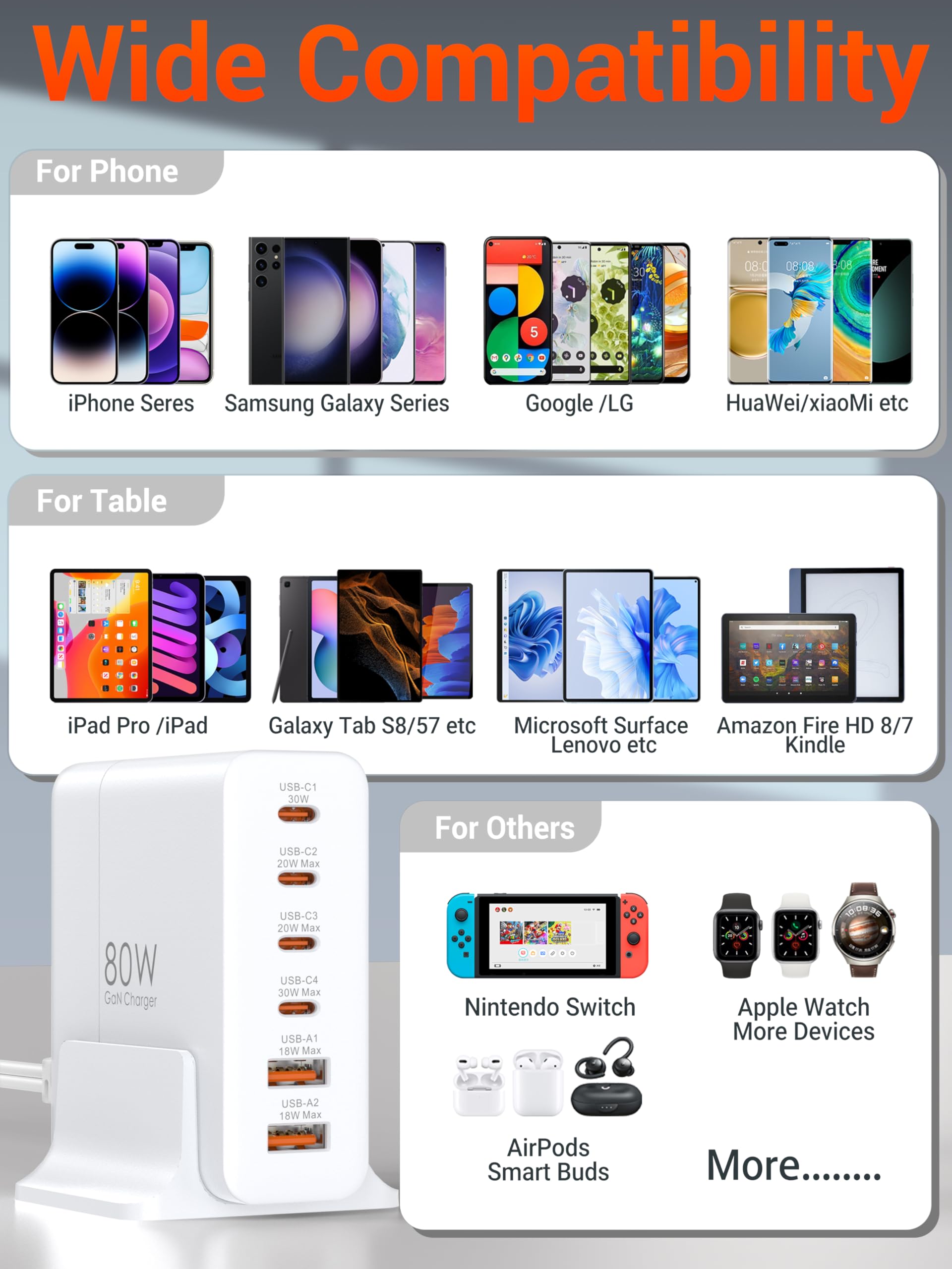 - 【80W Charging Station】This USB-C charger is compatible with PD3.0, PPS, QC3.0, 2.4A, AFC, FCP and other fast charging protocols, covering almost all smartphones and other electronic devices on the market. The maximum output of a single port is 45W, and the total power output is 80W. It only takes 30 minutes to charge iPhone 15 to 56% and Galaxy S23 to 60%.