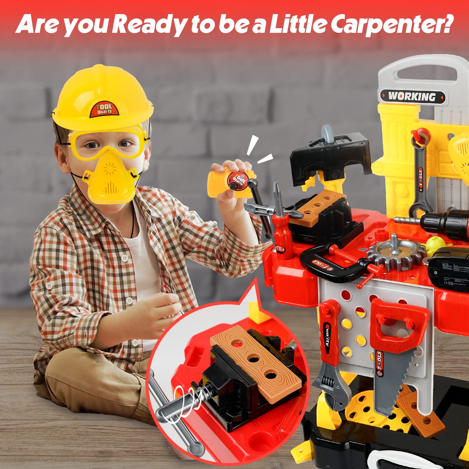 - 83pcs: Super value children's workbench set, engaged young handyman with all basic tools they will need to build, such as realistic screws, nuts, hammers, wrenches, electric drills, and helmets. These accessories not only add fun but also introduce kids to the importance of safety when playing.