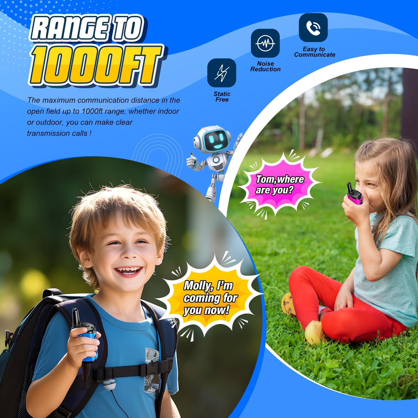 - Crystal Clear Communication: Advanced clear voice technology ensures that our child's voice is always heard loud and clear. With non-static communication, the walkie talkies have a range of up to 1000 feet in ideal conditions, ensuring that kids always stay connected