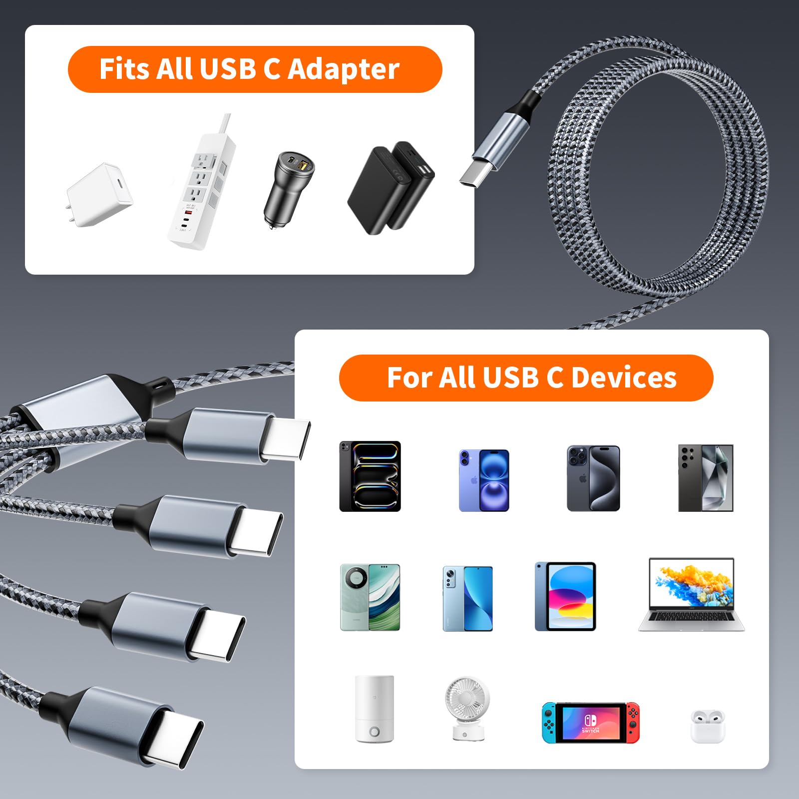 - 【USB C Splitter 4-in-1 Charging Cable】Charge your smartphone, tablet, cabinet lights, and mini fan simultaneously with one convenient cable,perfect for home, office, car, travel and business trips. One of usb c port support both QC 3.0(3A) fast charging and data transfer (data sync speed ups to 480Mbps).