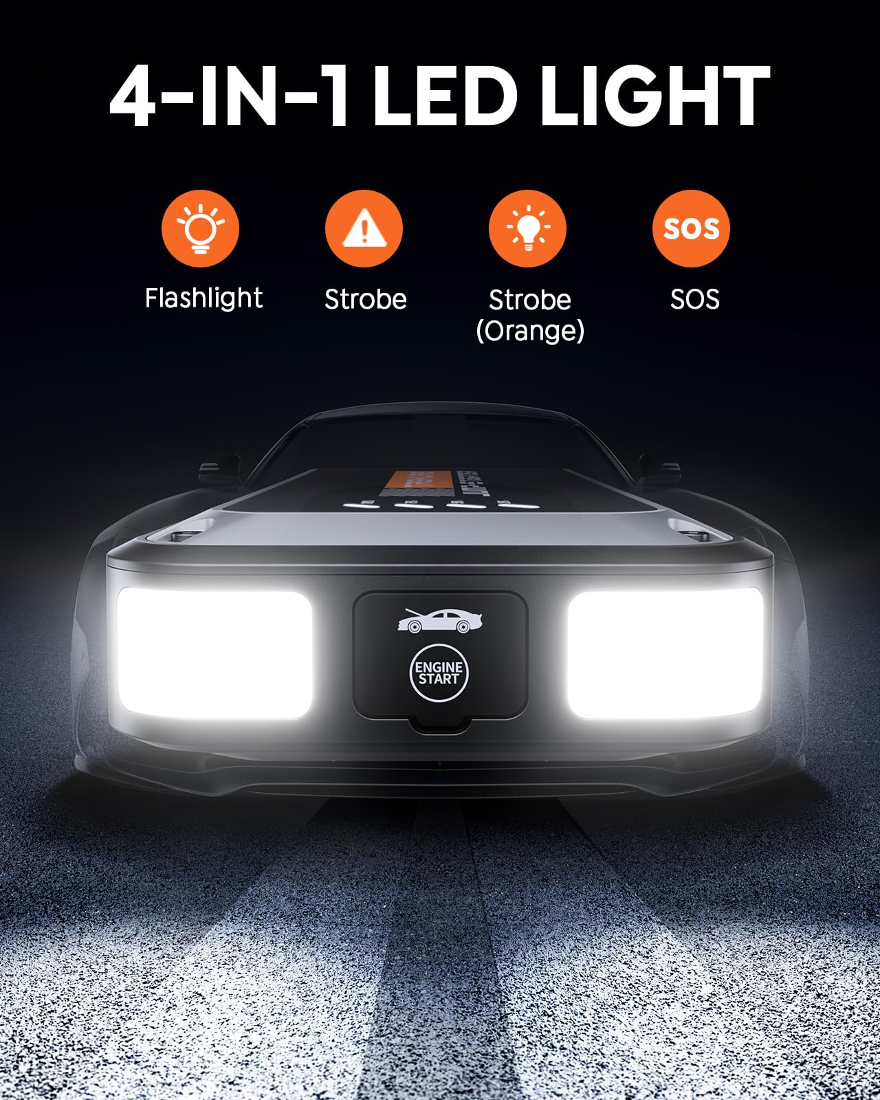 - 【Wide Angle Multifunctional Light】The jump pack features super bright lights in 4 modes (Flashlight, Strobe(White), Strobe(Orange), SOS). Dual-angle design, wider irradiation range. Suitable for changing tires or checking the engine, for warning or drawing attention, outdoor adventure, traffic accidents or doubling as a warning triangle and many other use scenarios. Make your journey safer.