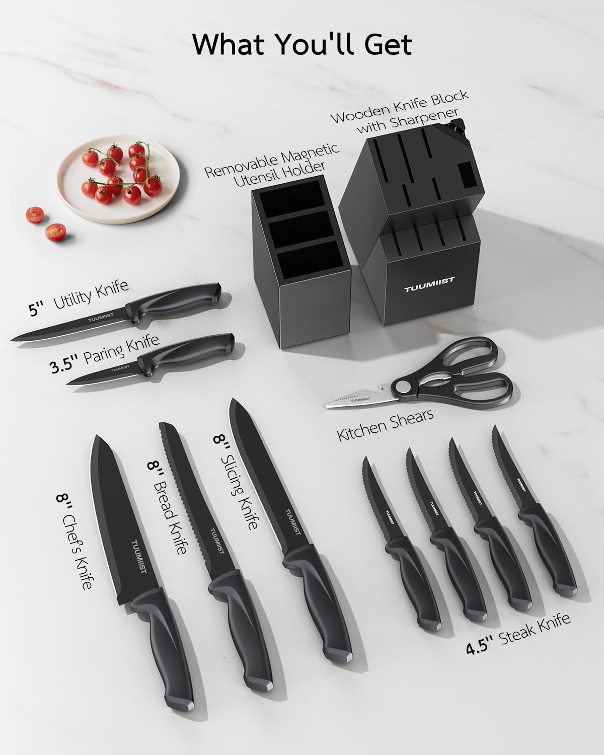 - Powerful Magnetic Holder: TUUMIIST knife set features a robust magnetic knife holder. Get away from kitchen clutter with our carefully designed storage solutions. Ensure that your kitchen tools are always neatly organized and accessible.