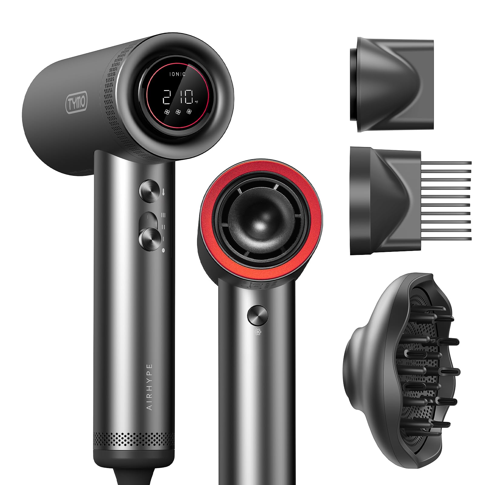- Three Magnetic Attachments for Versatile Styling - The TYMO hair dryer comes with three attachments - a smoothing nozzle, a comb nozzle, and an adjustable diffuser. The prongs of the diffuser can be adjusted up and down to suit different drying needs, making it ideal for curly hair.