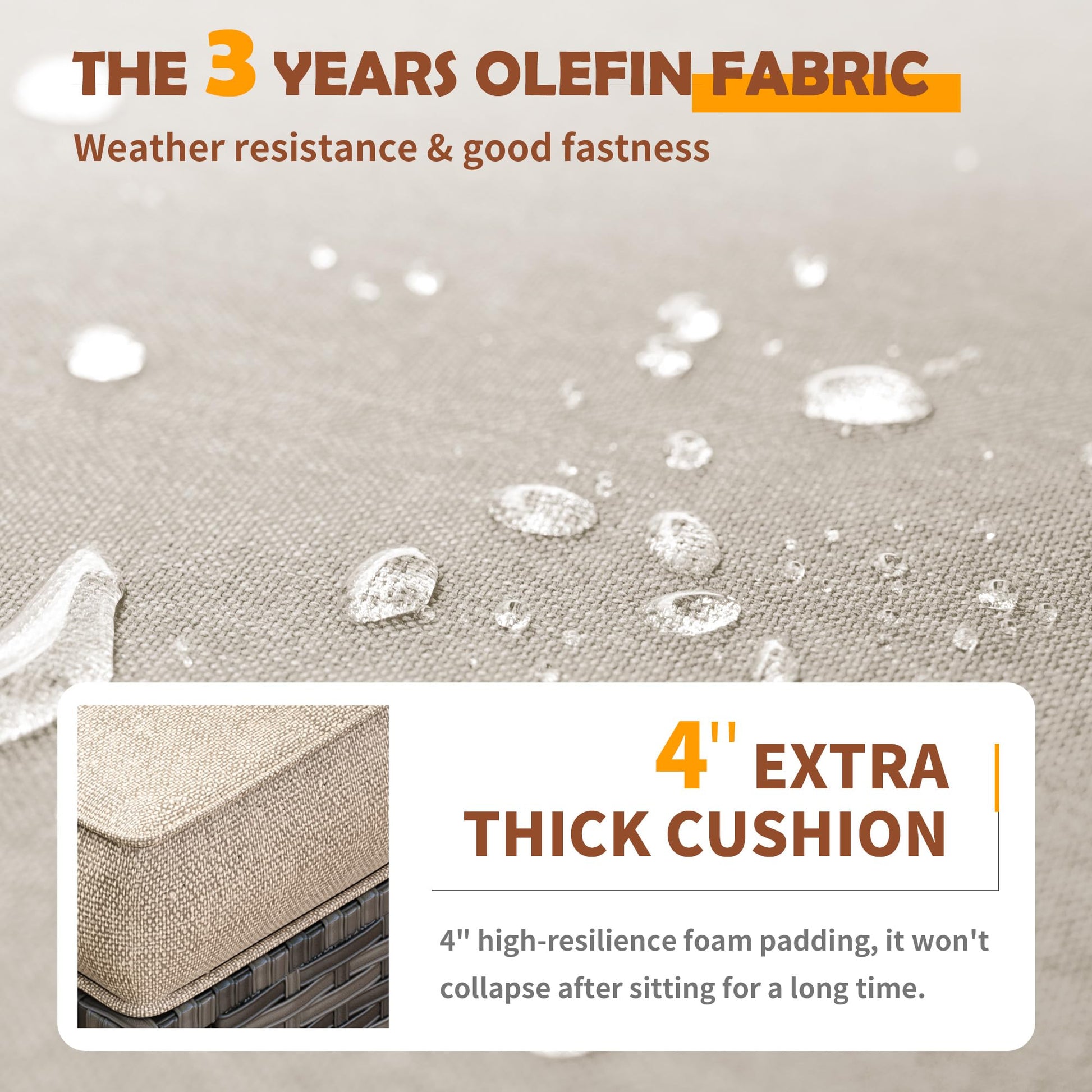 - 【EXTRA COMFORT OLEFIN CUSHION 】Patio furniture sets are crafted with Olefin fabric, which is extremely soft and enhanced with better resistance to fading, tearing, and wear. The 4-inch thick cushion is filled with a thickened high-resilience sponge to stay fluffy & non-deformation and give your body plenty of support.