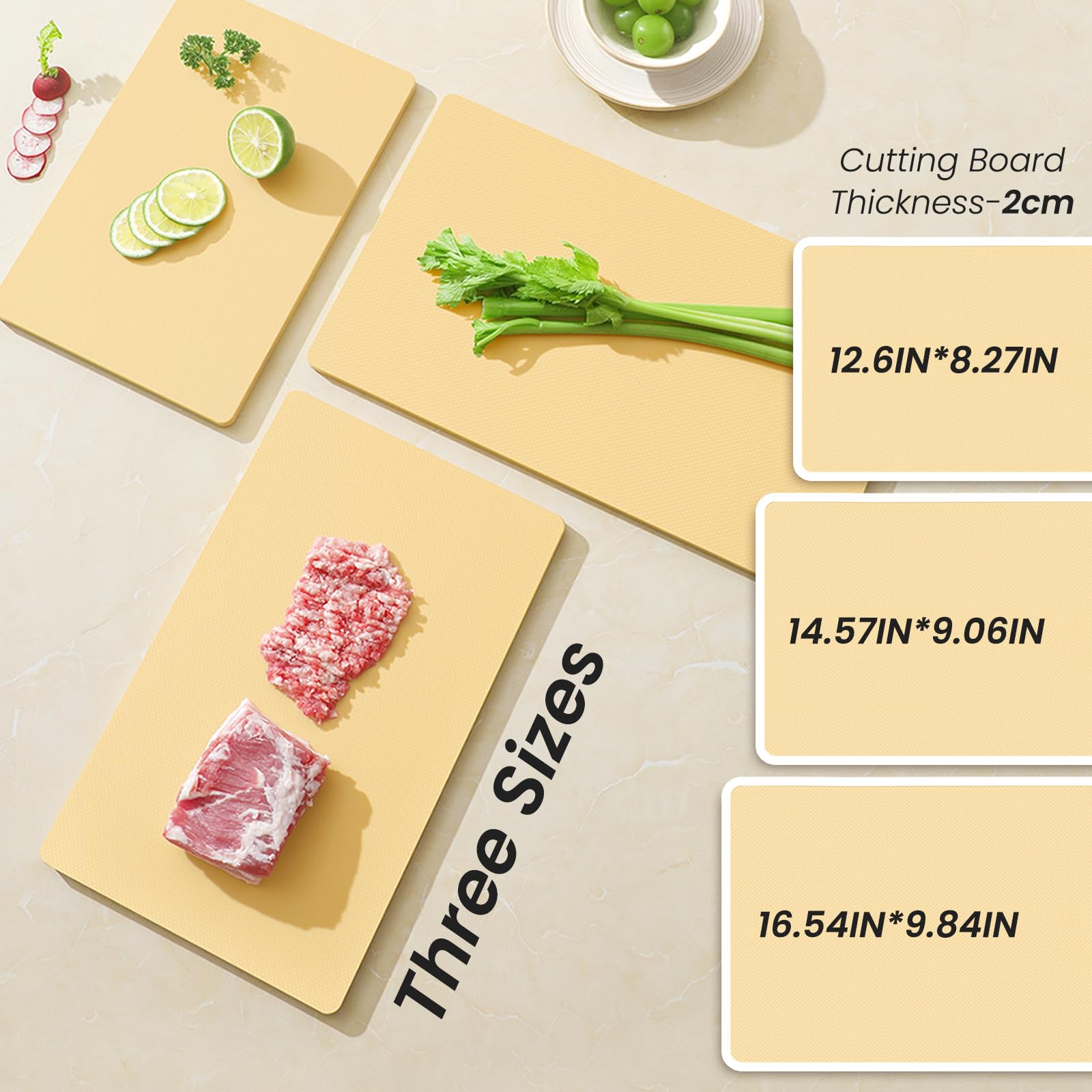 - [DURABLE & MULTI-SIZE OPTIONS] Crafted with durability in mind, our kitchen cutting board comes in multiple sizes, including small (8.3*12.6*0.79”), lagre (9.9*16.5*0.79”). Its robust construction ensures it's thick and resistant to cuts, providing stability during use. Perfect for slicing bread, fruits, vegetables, meats, steaks, cheeses, and more.