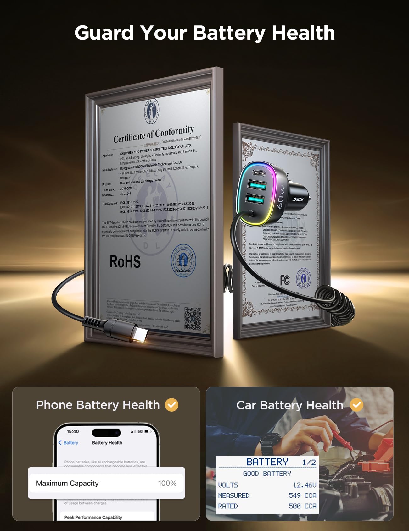 - 【Safety Multiple Protection】JOYROOM Car Charger Adapter built-in intelligent safety chip, through UL, FCC, CE, RoHS and other certificates, with over-current, over-voltage, short-circuit, over-temperature,over-power,under-voltage and other multiple safety protection functions.Adopting PC flame retardant V-0 grade material, no heat generation, flame retardant and environmentally friendly