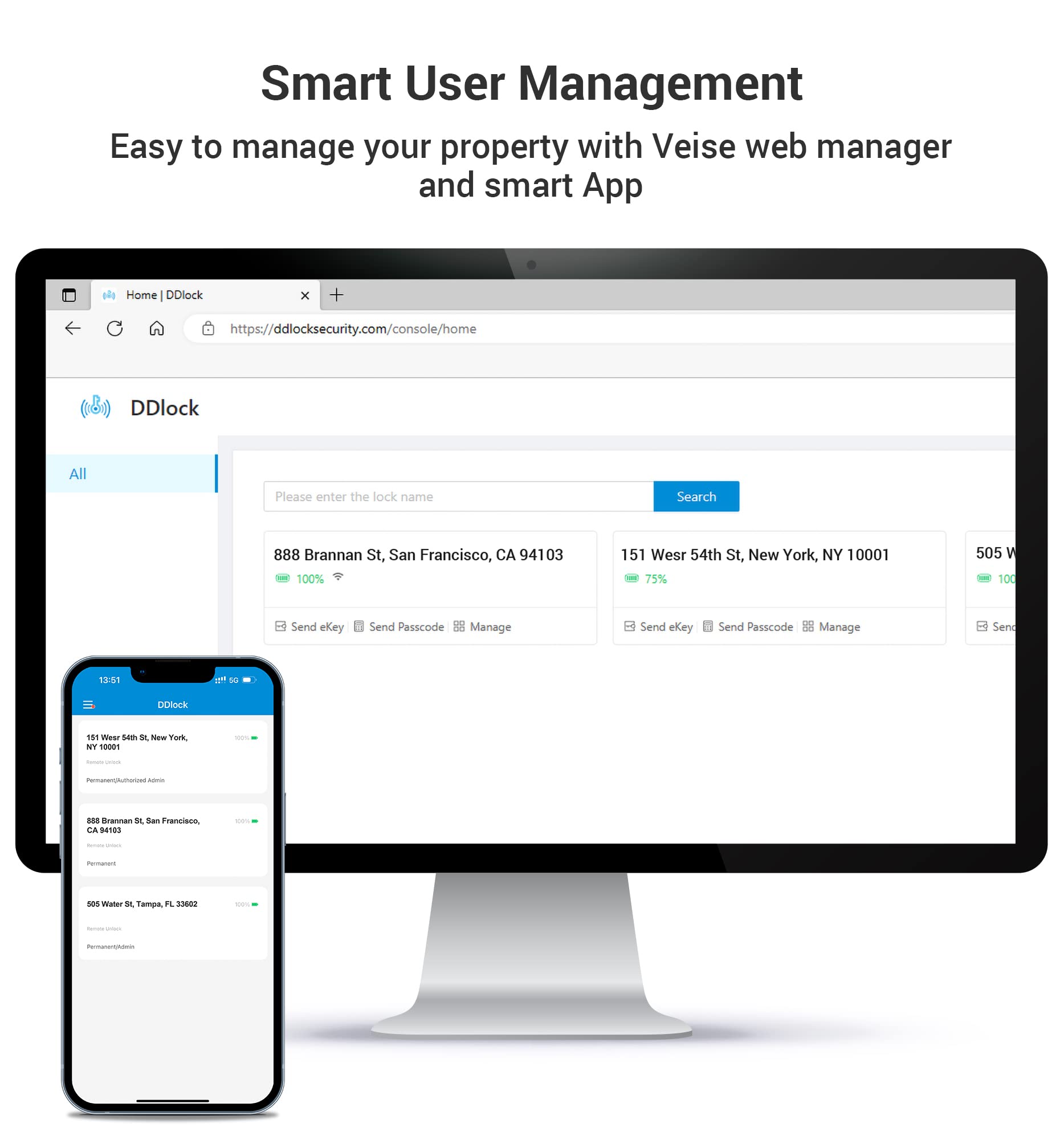 - App & Web Portal Control: You can control the smart lock via smartphone, remotely generate eKey and grant access, manage users, and view records in the app and website management system. The App & Web is free and can be used forever
