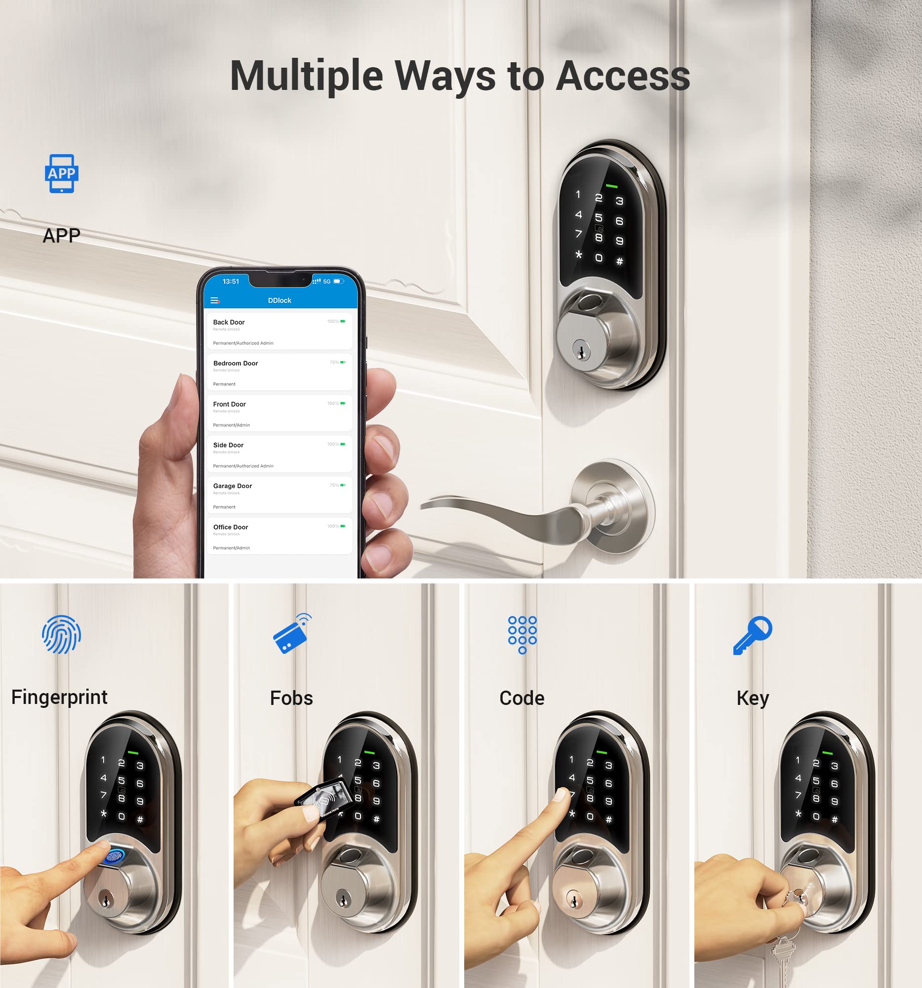 - 7-in-1 Smart Door Lock: Access your smart lock via Fingerprint + App + Web portal + Fobs +Code + eKey sharing + Mechanical key