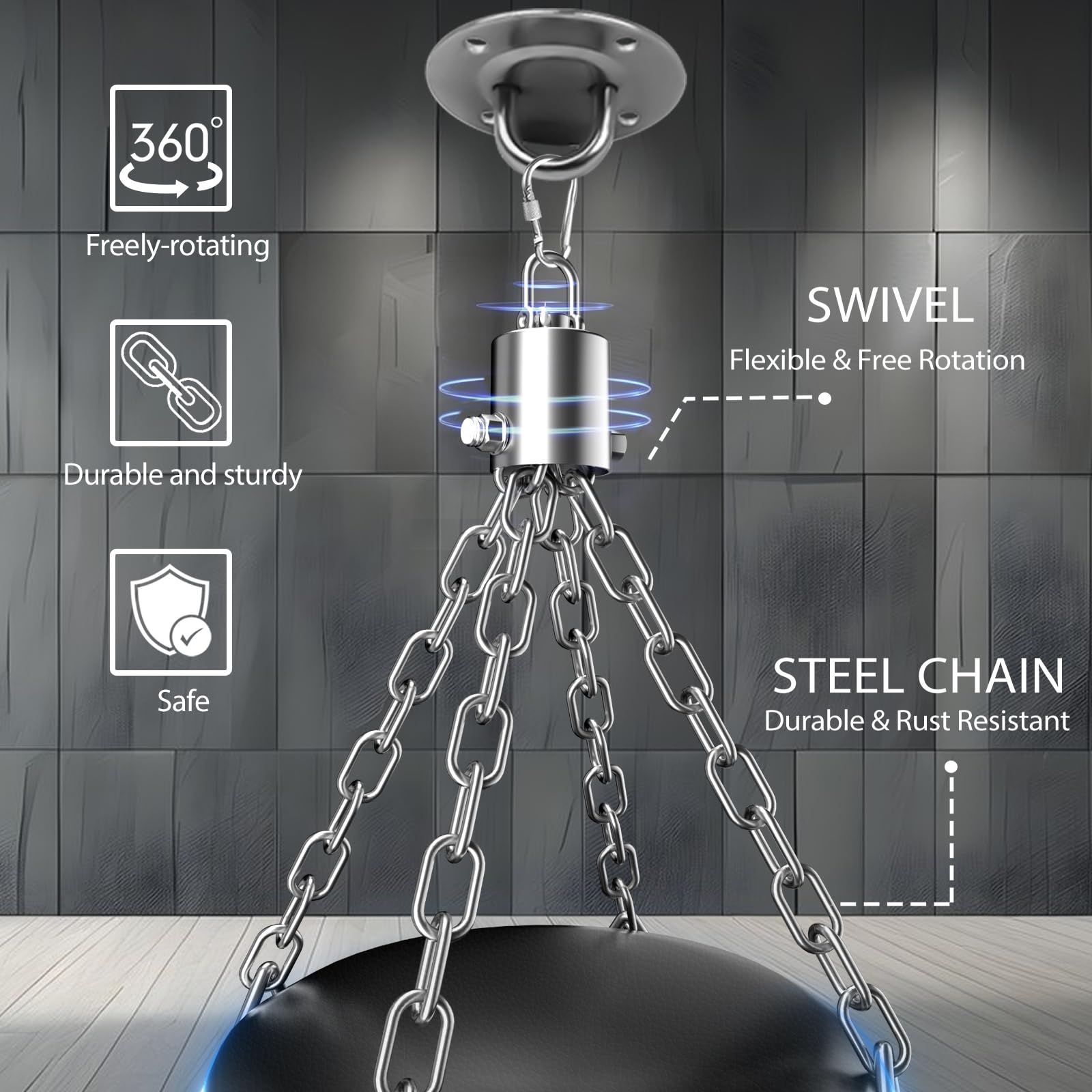 - 【Stainless Steel 360° Swivel】The sturdy 360° swivel ensures that the heavy punching bag rotates flexibly and has strong load-bearing capacity, fully ensuring your safety and stability during use