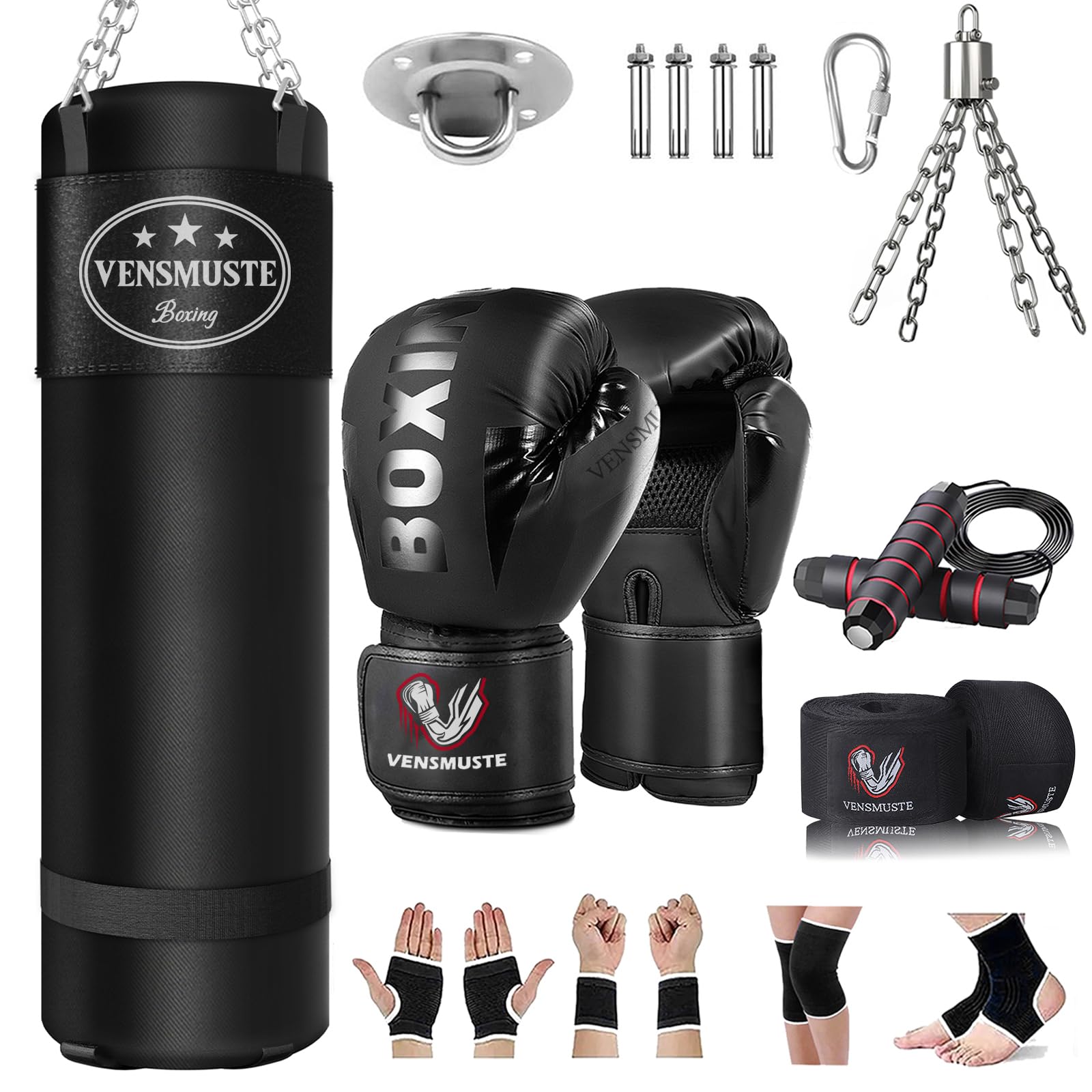 - 【Complete Boxing Equipment】Includes 1 x 4ft punching bag(Unfilled),1 x 12oz boxing gloves,1 x pair of hand wraps,1 x 360° rotation,4 x Expansion bolt,1 x connecting carabiner,1 x boxing bag hanger,1 x jump rope,1 x chain,1 x Expansion hook,1 x pair of hand, wrist, ankle, knee