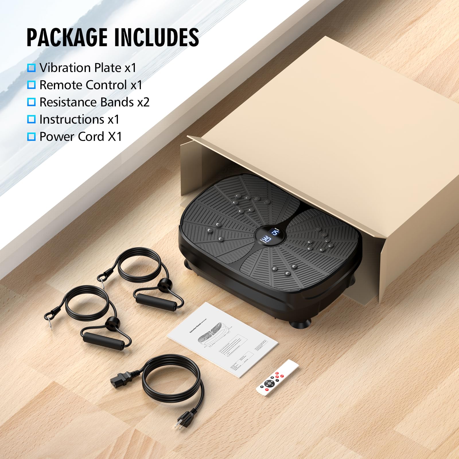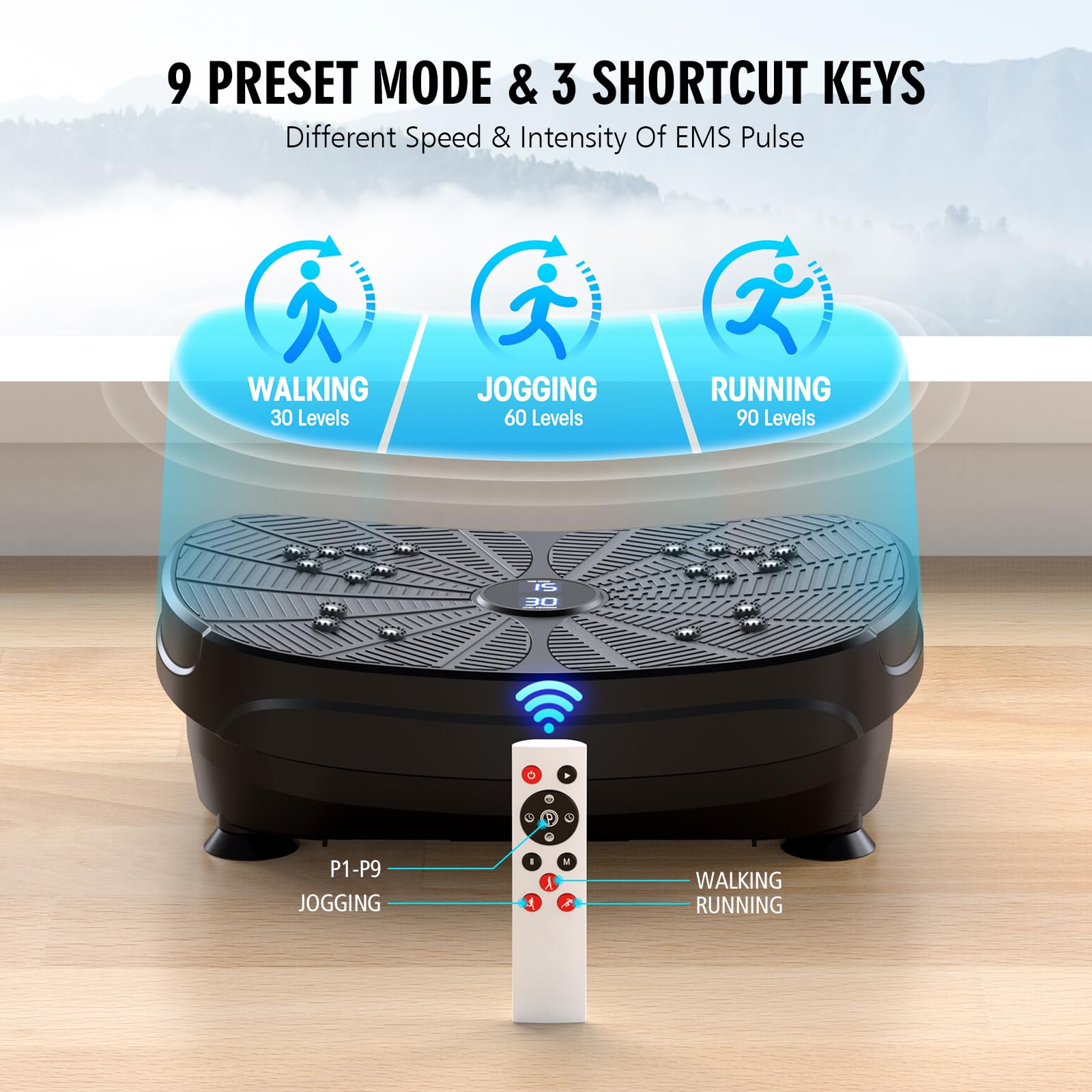 - REMOTE CONTROL & EASY TO STORAGE - With the remote control, you can remotely control the machine. The LED lighted display allows you to easily see the time and speed for a clear view of your workout. Compact vibrating plate design with only 7.5kg weight, can save space, easy to carry and store. Turn any place into your personal gym.