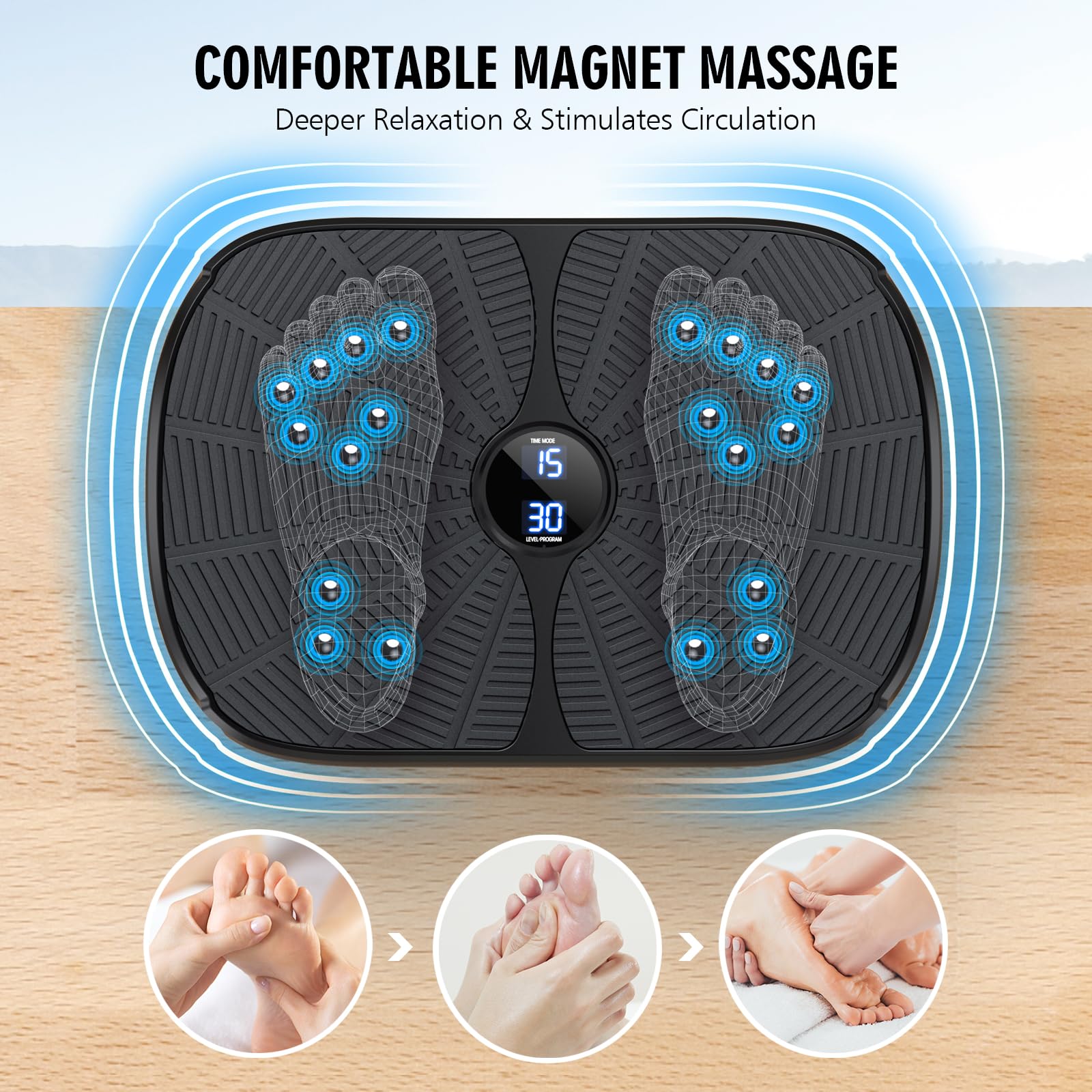 - MAGNET MASSAGE POINTS - Stimulate the feet through magnet on the vibration plate surface, perform lymphatic drainage & acupoint massage. It also can effectively improve blood circulation & boosting metabolism. Cooperated with different modes can strengthen core strength while increasing flexibility. Please consult your doctor if you have special medical conditions before using this product. E.g. pregnant and in menstrual period, cardiovascular diseases, osteoporosis, heart problems, hypertension