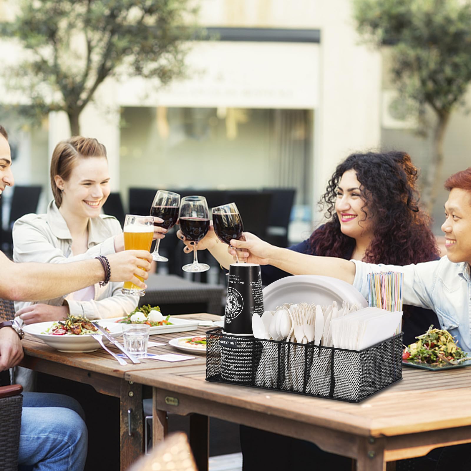 - 【Great for Camping and Picnic】 Ideal for camping and picnics, this caddy offers ample space for all your essentials. It enables you to effortlessly store paper plates, silverware, cups, and napkins, providing easy access to everything.