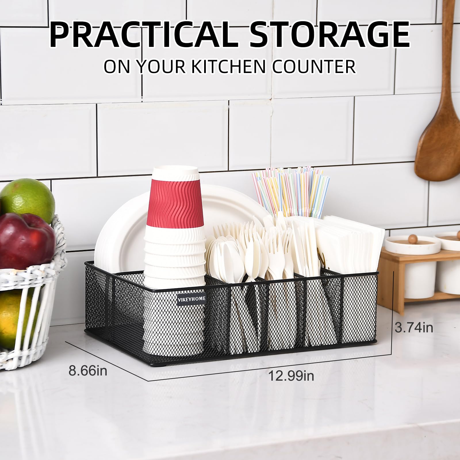 VIKEYHOME Paper Plate Organizer for Countertop, Metal Silverware Caddy with 6 Compartments for Plate, Cup, Napkin, Paper Plate and Utensil Holder Caddy for Party, Camping, Picnic