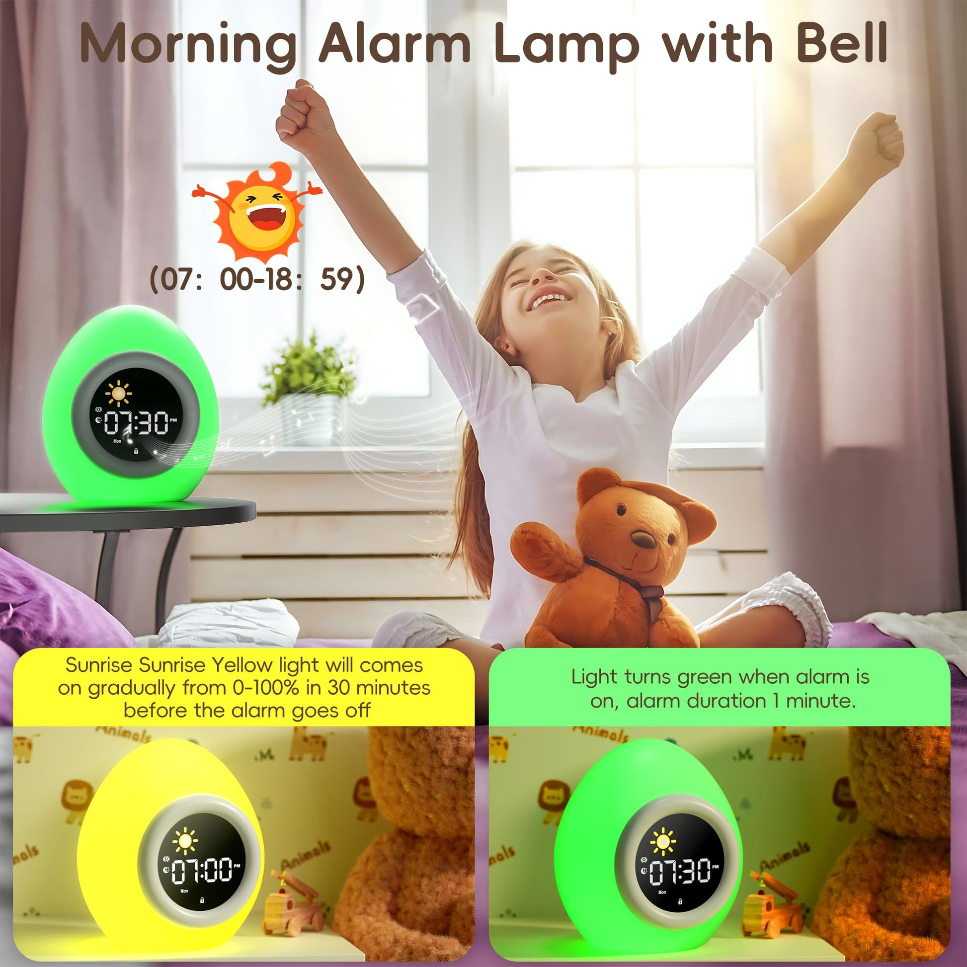 - 【Accurate Wake-up Light and Sleep Trainer Alarm Clock for Kids】 Kids alarm clock features both light wake-up and white noise sleep functions. Starting 30 minutes before the alarm sounds, children can experience the gradual illumination of sunlight in their room, reaching its brightest state at alarm time. When the sleep alarm goes off, children can drift into sleep accompanied by gentle white noise