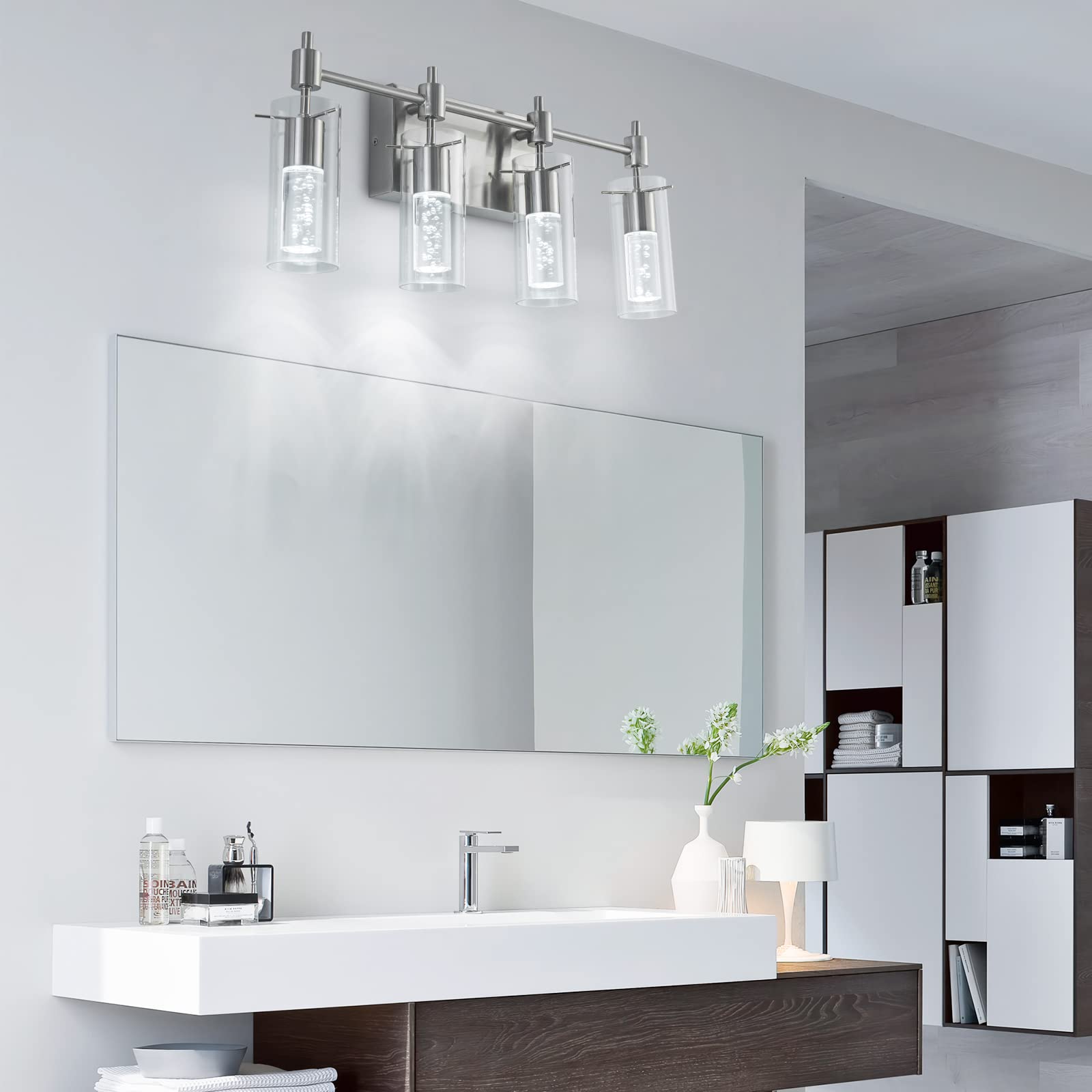 - π‘[Modern & Unique Design] - The 32W 85-265V 6000K 4-Light Bathroom vnity light are built in a Bubble material body with clear shades,Bruhed Nickl vanity lights will bring more exquisite and luxurious for your home lighting. The gorgeous vanity light for mirror is highly suited for any decoration style, it is also the perfect choice for your home lighting.