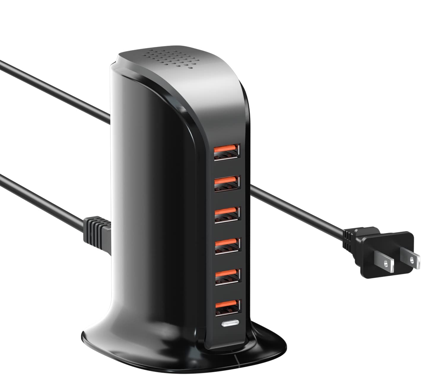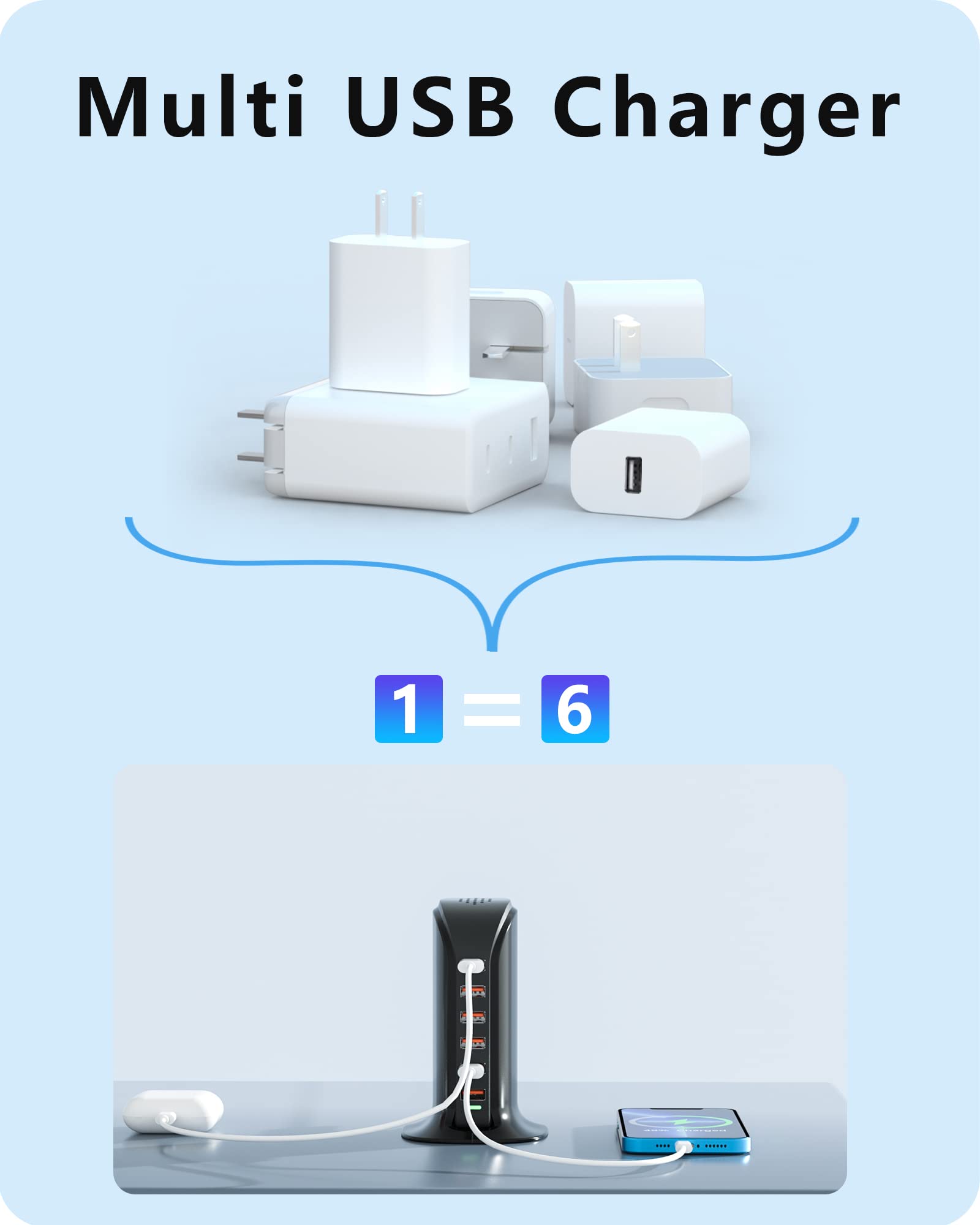 VPSUN USB Charger 6 Port 50W Multi USB Tower Charging Station for Multiple Devices iPhone 15/14/14 Pro/14 Pro Max/13 Pro/13 Pro Max/Android/Samsung/Tablet,etc(Black USB)