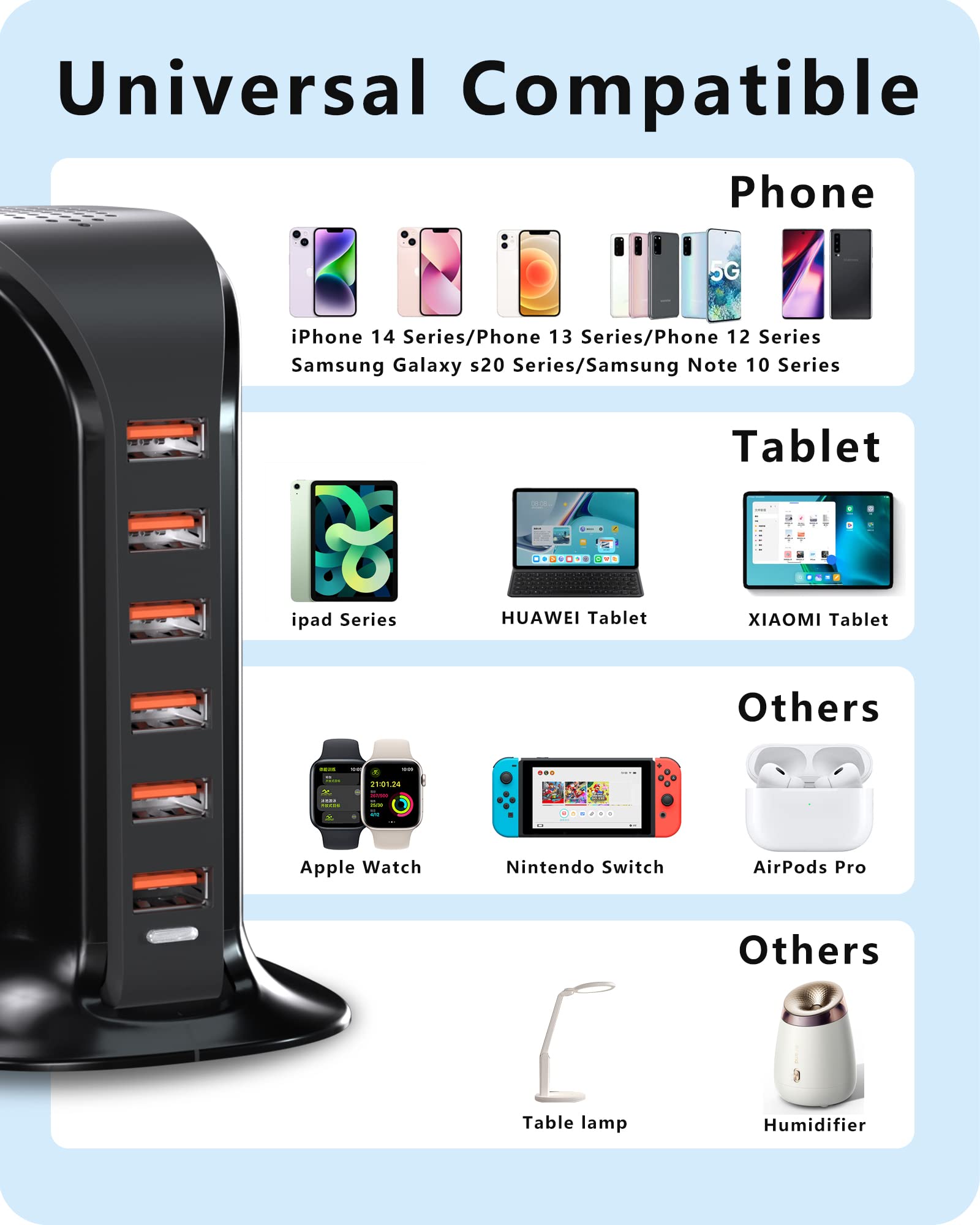 - 50W USB Charger - our 50W charging station was compatible with all USB devices - smartphones, smartwatches, tablets, speakers, headphones, cameras, PSPs and more