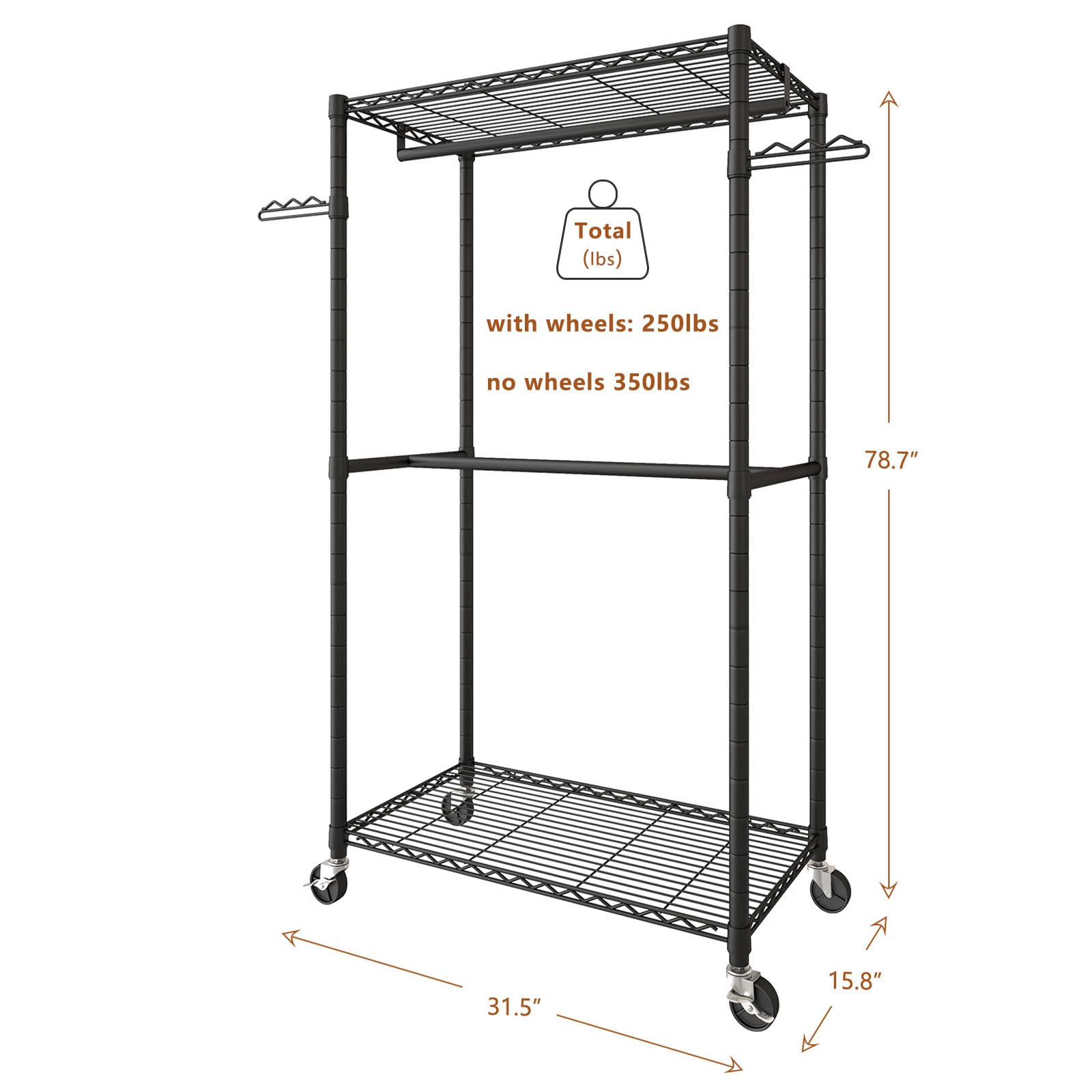 - Heavy-duty construction: each hanger rod hold up to 110lbs, 2 shelves hold up to 88 lbs, one on top and on the bottom, 79" height allow hanging longer garments without dragging , No tools required for assembly,Shelves keep sturdy when fully loaded , heavy duty capacity design , hooks are also sturdy, durable,no wobble;