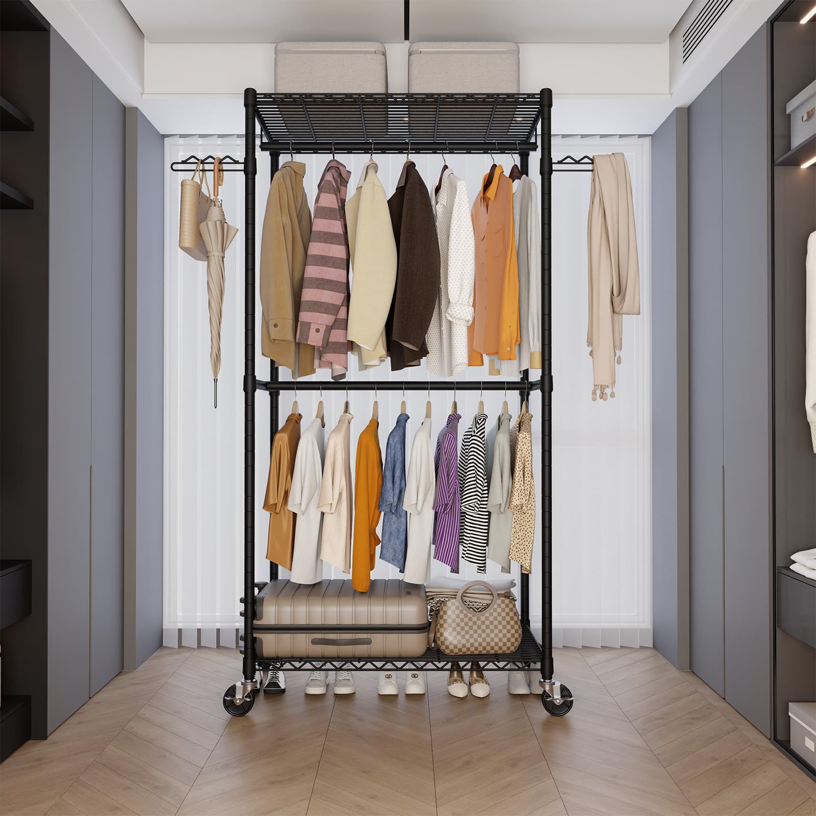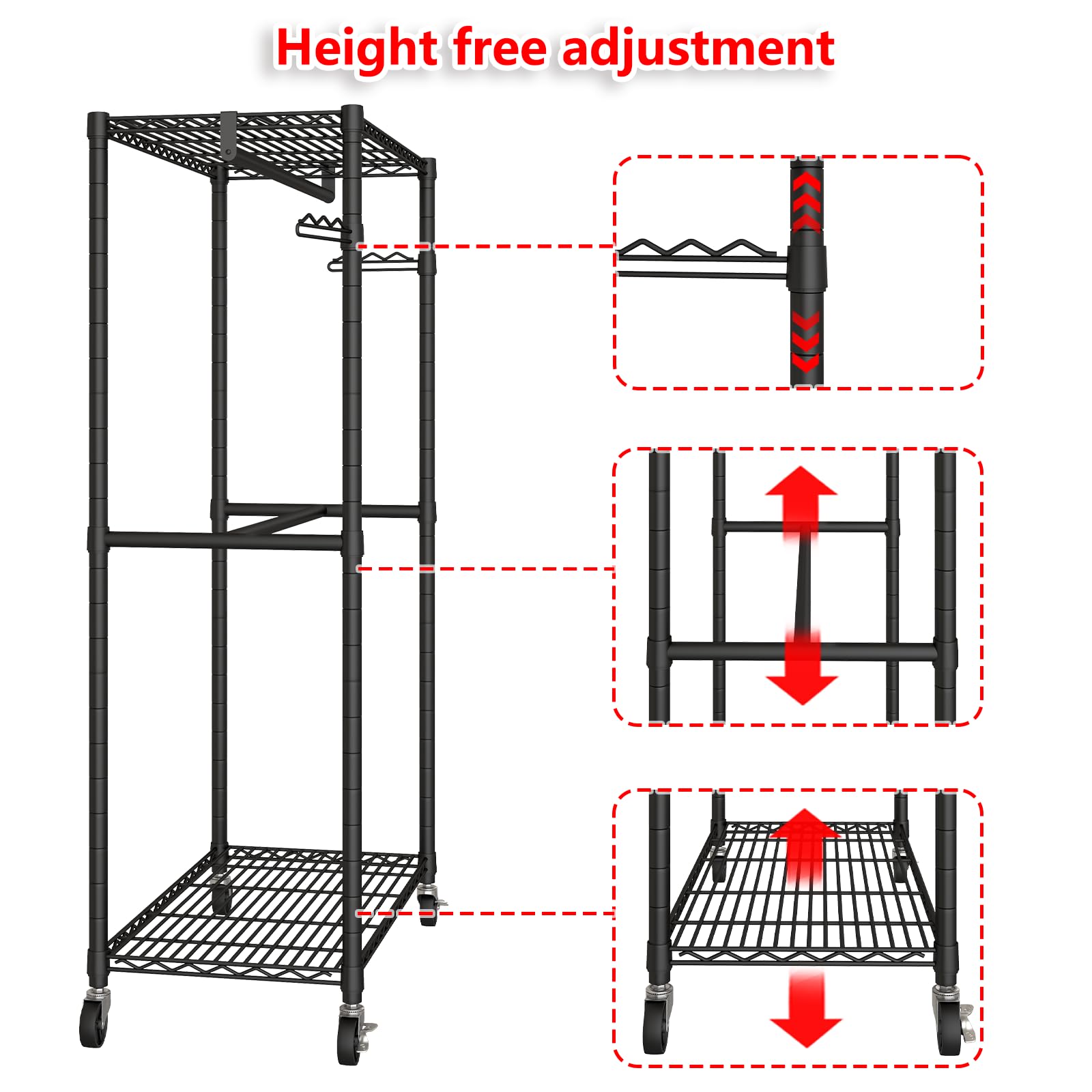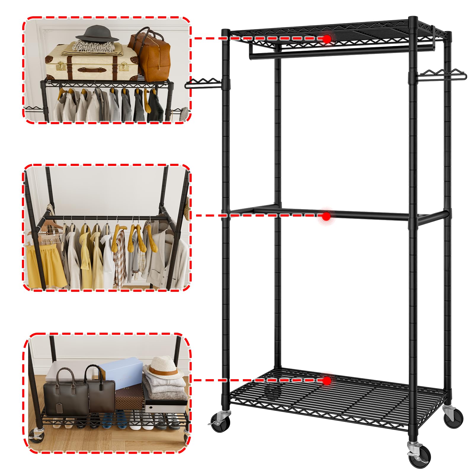 - Adjustable : shelves adjust to accommodate different garment lengths,Rolling garment rack includes 2 sturdy Adjustable shelves and adjustable 2 hanging rods
