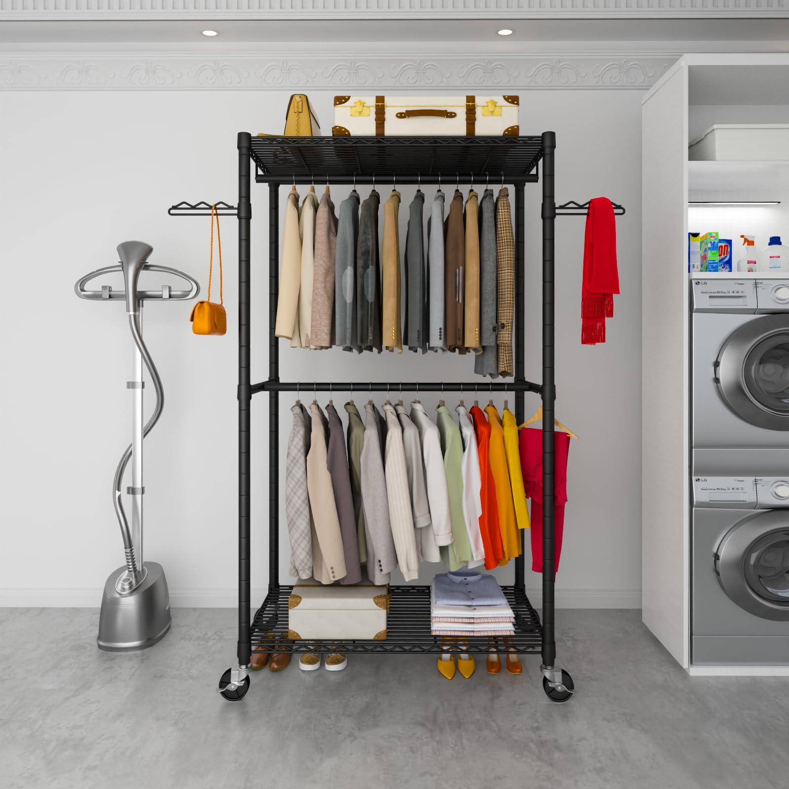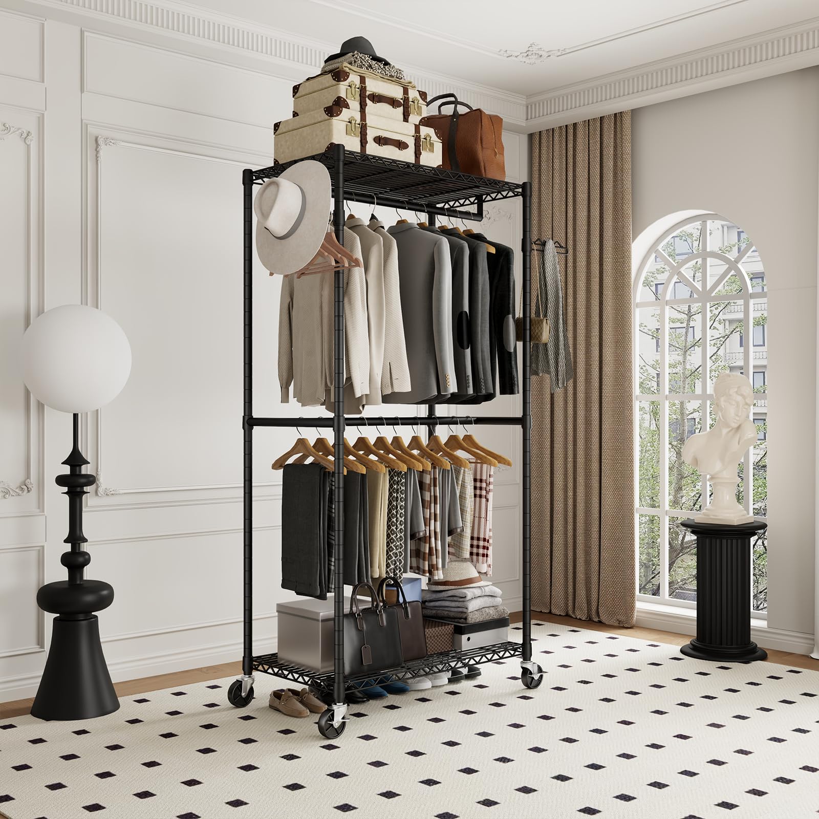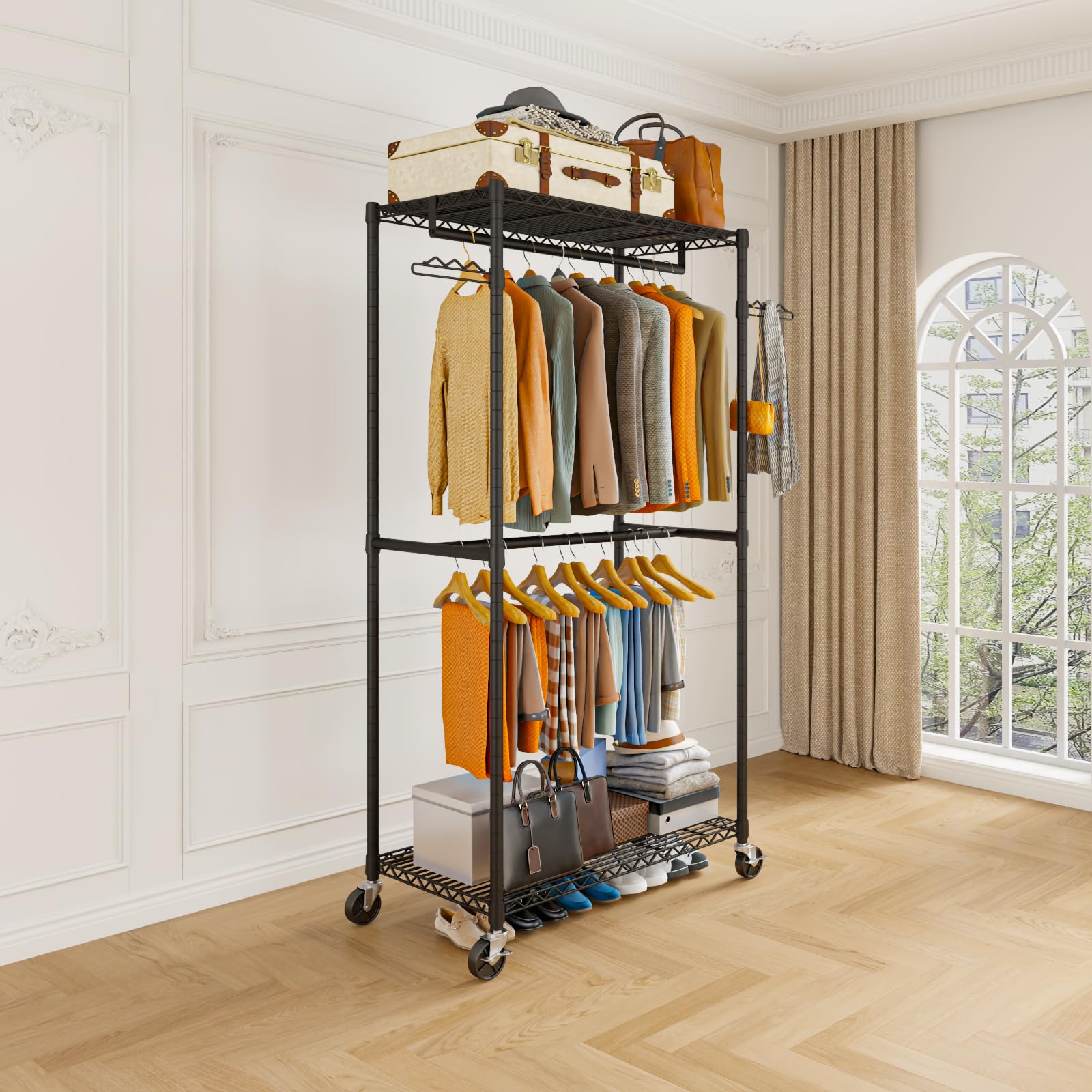 - Adjustable : shelves adjust to accommodate different garment lengths,Rolling garment rack includes 2 sturdy Adjustable shelves and adjustable 2 hanging rods