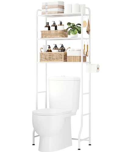 - CREATE VERTICAL STORAGE SPACE: Say goodbye to cluttered countertops and limited floor space! This over-the-toilet bathroom cabinet utilizes the unused area above your toilet, offering generous storage capacity without taking up additional room. Featuring 3 mesh shelves, a toilet paper holder, and 5 versatile hooks, it's ideal for organizing bathroom accessories, towels, bathrobes, or small baskets, keeping essentials neatly arranged and easily accessible.
