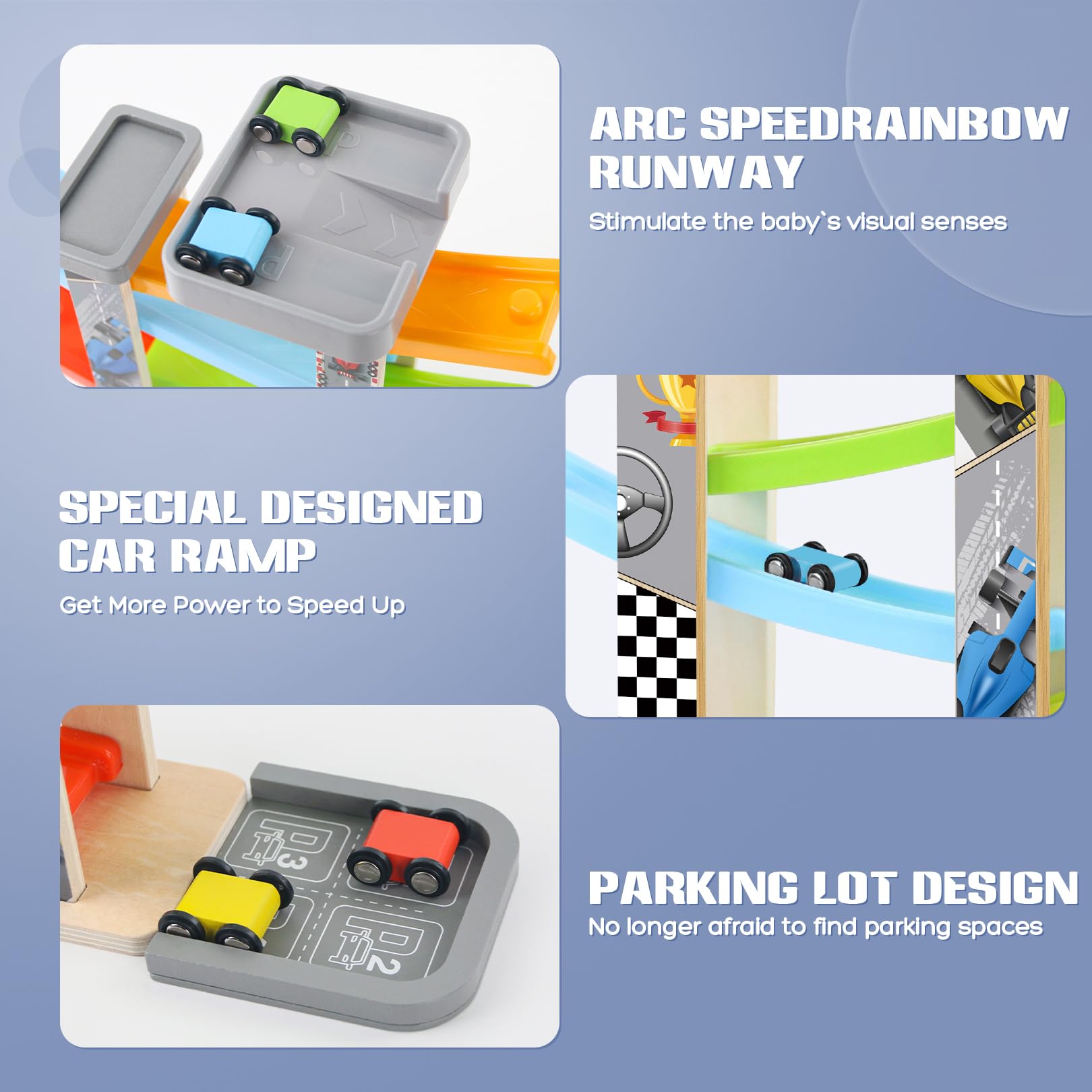 - Engaging & Fun Racing Experience: Watch as your little ones send 4 colorful mini cars zooming down 4 vibrant ramps! With 2 parking lots this toy stimulates both visual tracking and imaginative play