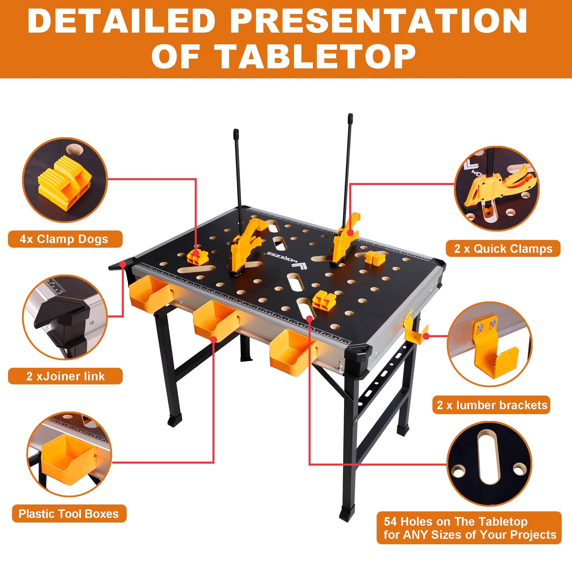 - 【VERSATILE TABLETOP】Work bench table top has 54 evenly spaced pre-drilled dog holes, allowing 2 clamps to be used horizontally or vertically at any place with 4 bench dogs to fix items of multiple sizes and shapes as you want. 3 toolboxes and imprinted metric scale keep both small items and efficiency at your fingertips.