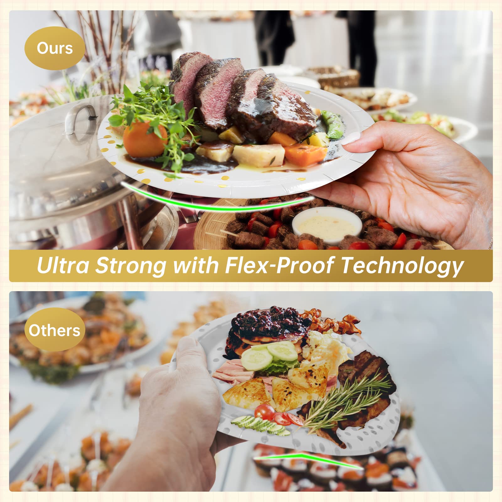 - The disposable paper plates is made of 350gsm thickened environmentally friendly paper,and the soak-proof layer on the surface,Cut resistant and Soak-Proof,white and gold napkins are 2-ply,soft and absorbent.(NOTE: Do not microwave the disposable tableware)