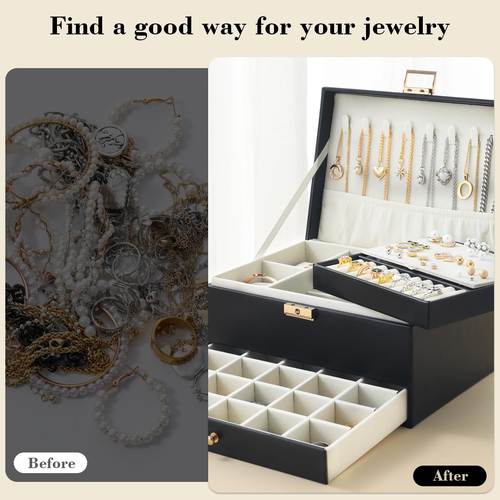 - Display Your Charms:Jewelry boxes for women will be separated and untangled your jewelry, top lid with 8 hook for your necklace and pandent,elastic shirred catch pouch keeps pandent neat and stay in place,top drawer for watches, bracelet, earring and rings collect, easy to find and catched your need moment time,Third layer boasts a specially designated area for your precious jewelry pieces, ensuring easy access and perfect storage