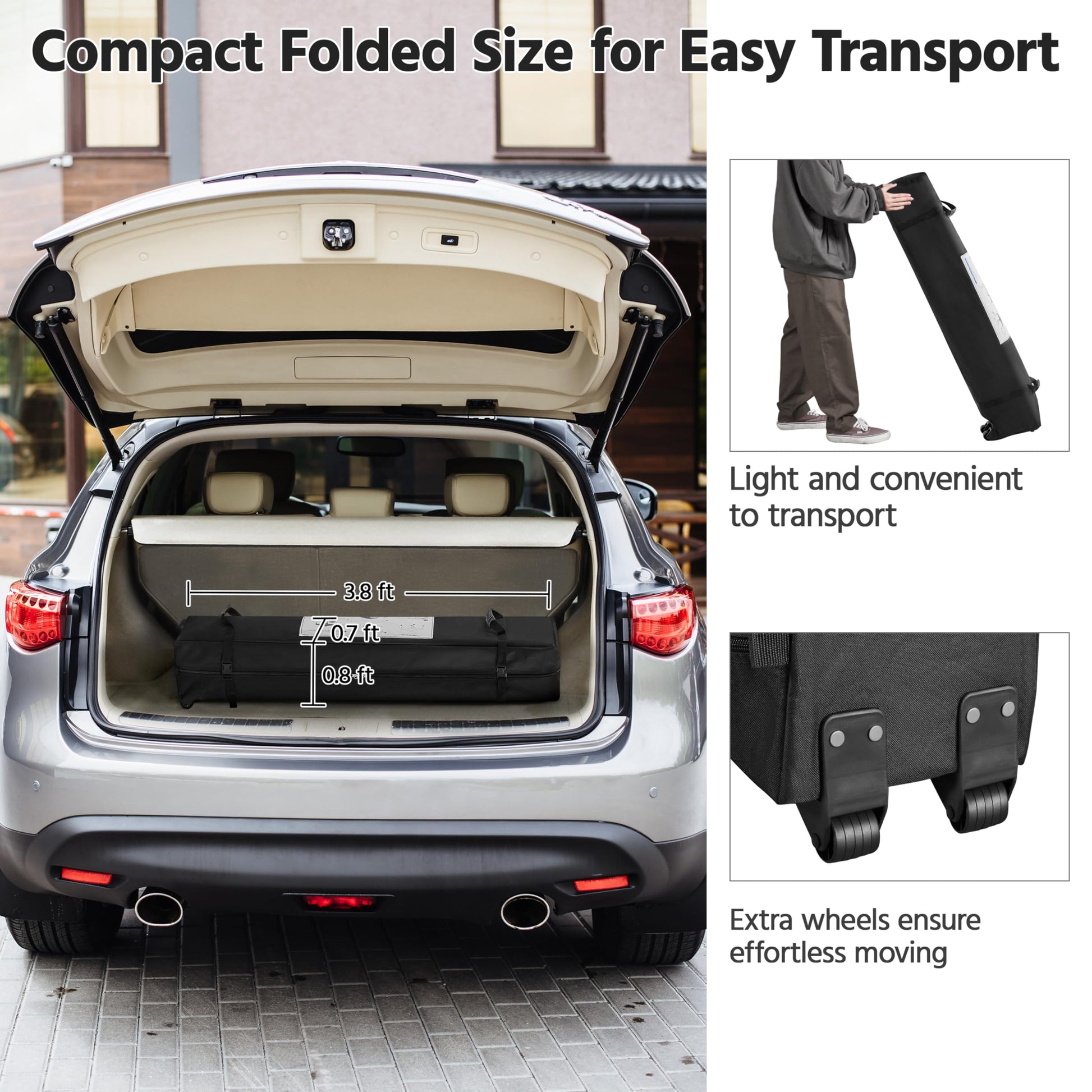 - Easy Mobility With Wheeled Bag: When folded, this outdoor canopy tent conveniently fits into the included rolling bag, measuring 10″ L × 8″ W × 45.3″ H. This convenient design ensures hassle-free transportation, whether you're heading for travel, camping, or other outdoor escapades