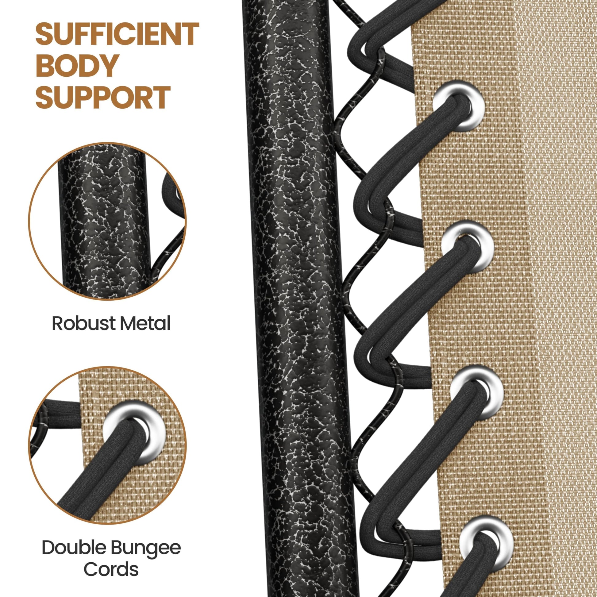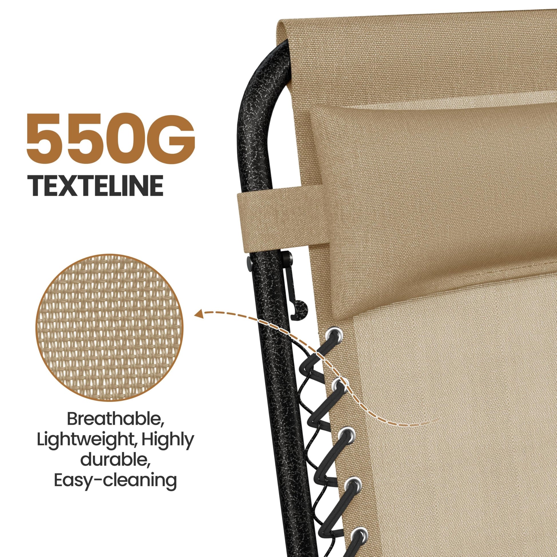 - Adaptive Reclining System: This zero-gravity outdoor recliner aims to offer you an ultimate relaxation. The premium recliner system allows the backrest and footrest to be easily adjusted and firmly fixed at your comfortable angle. The Texteline surface, fixed on the metal frame with elastic straps, adapts to your figure and provides each part of your body with sufficient support